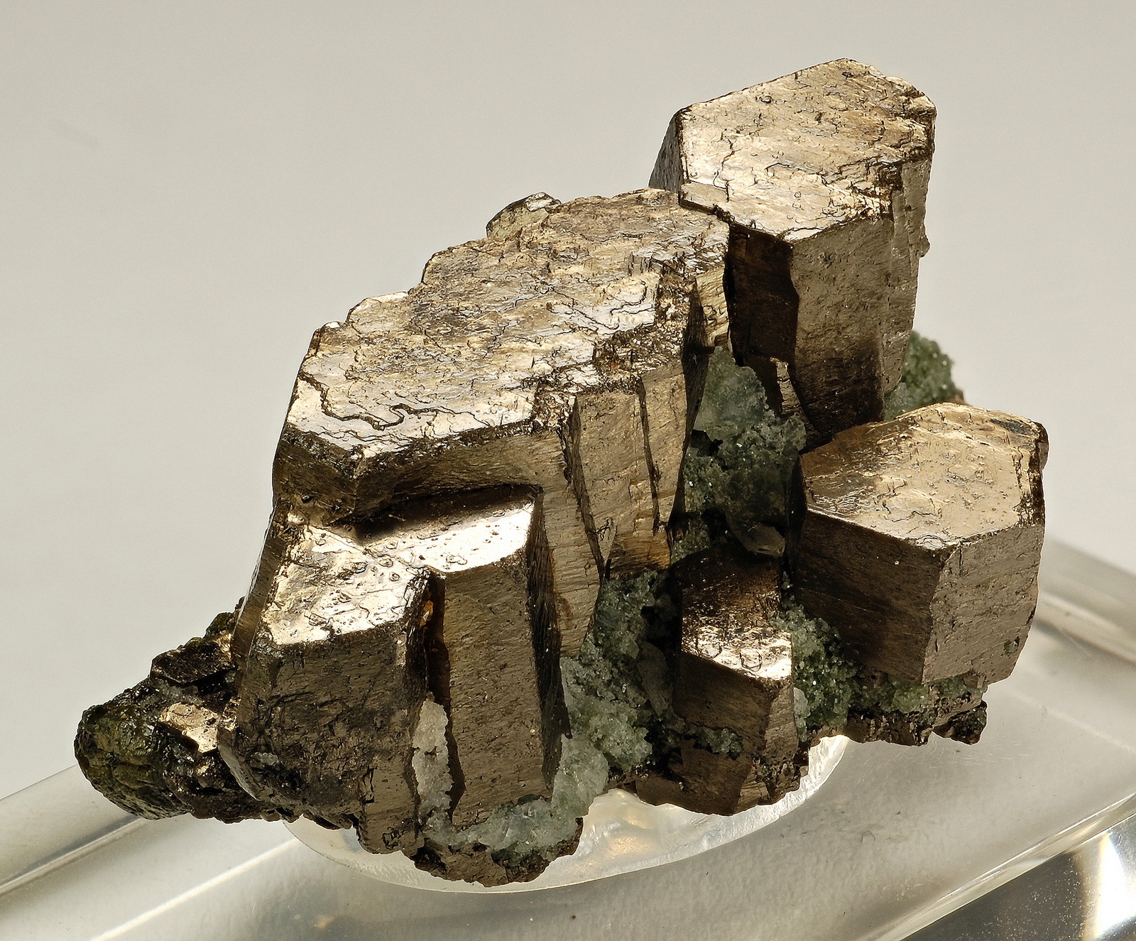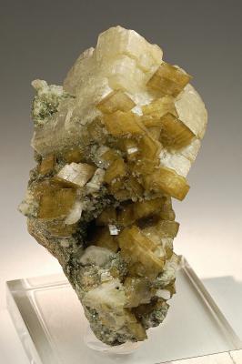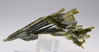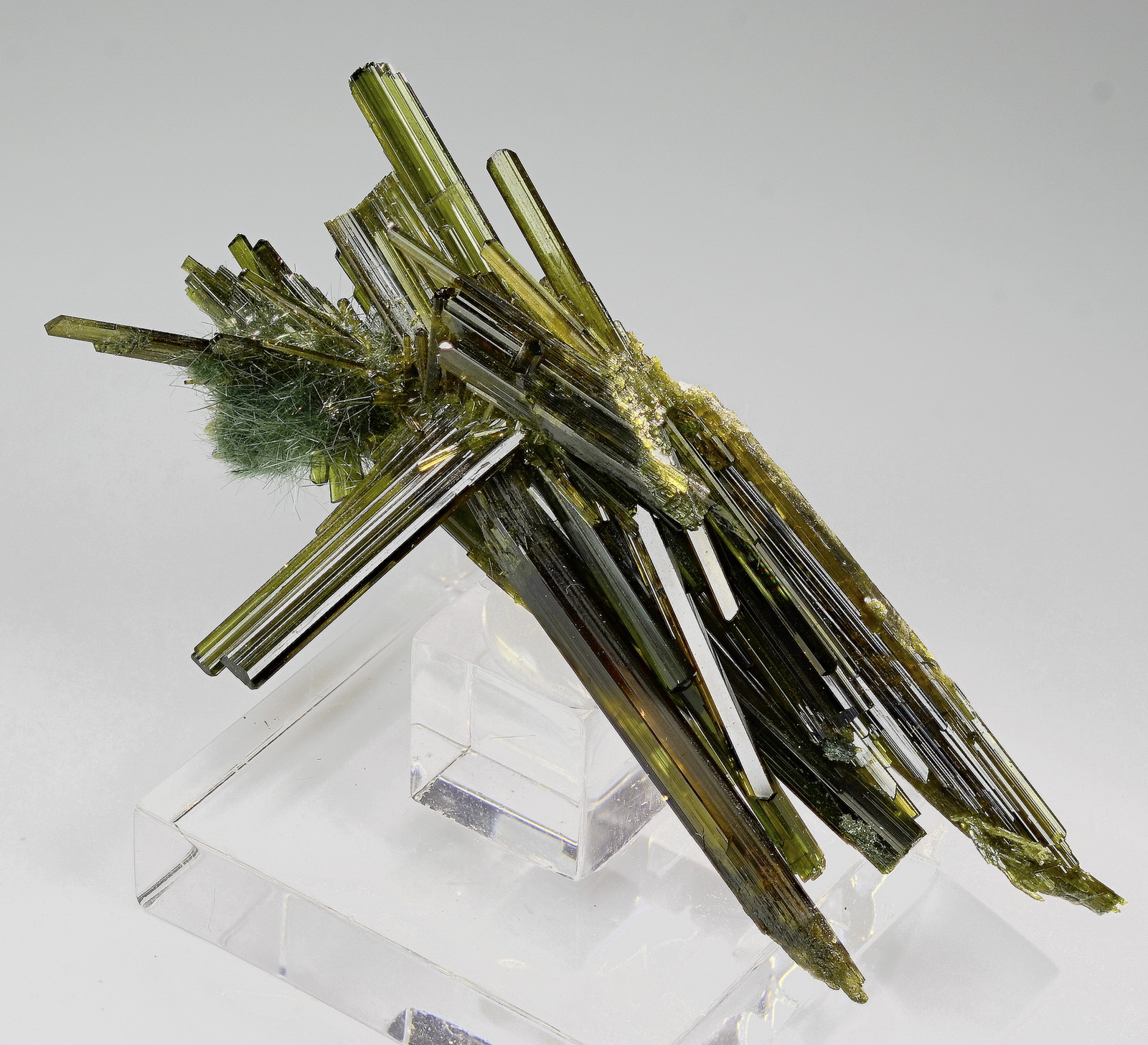 What a fabulous epidote floater aggregate! Top lustre, colour and clarity combined with great aesthetics. A nice nest of byssolite is present on left side. Great condition and visual impact!