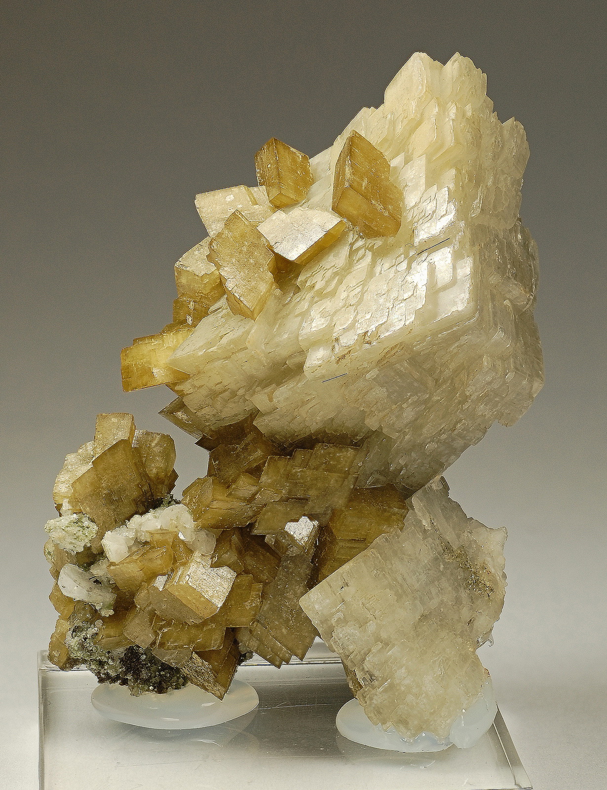 Gorgeous siderite crystals perched on white dolomite. this piece comes from an old classic find in Furka tunnel, more than 25 years ago. Tiny rutile needles are present in combination. No damage.