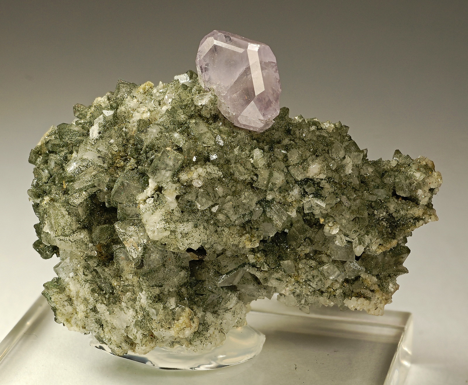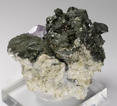 WOW! What a beautiful purple apatite crystal perched on adularia and chlorite matrix. The apatite measures 15 mm across and displays very well from all sides.