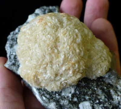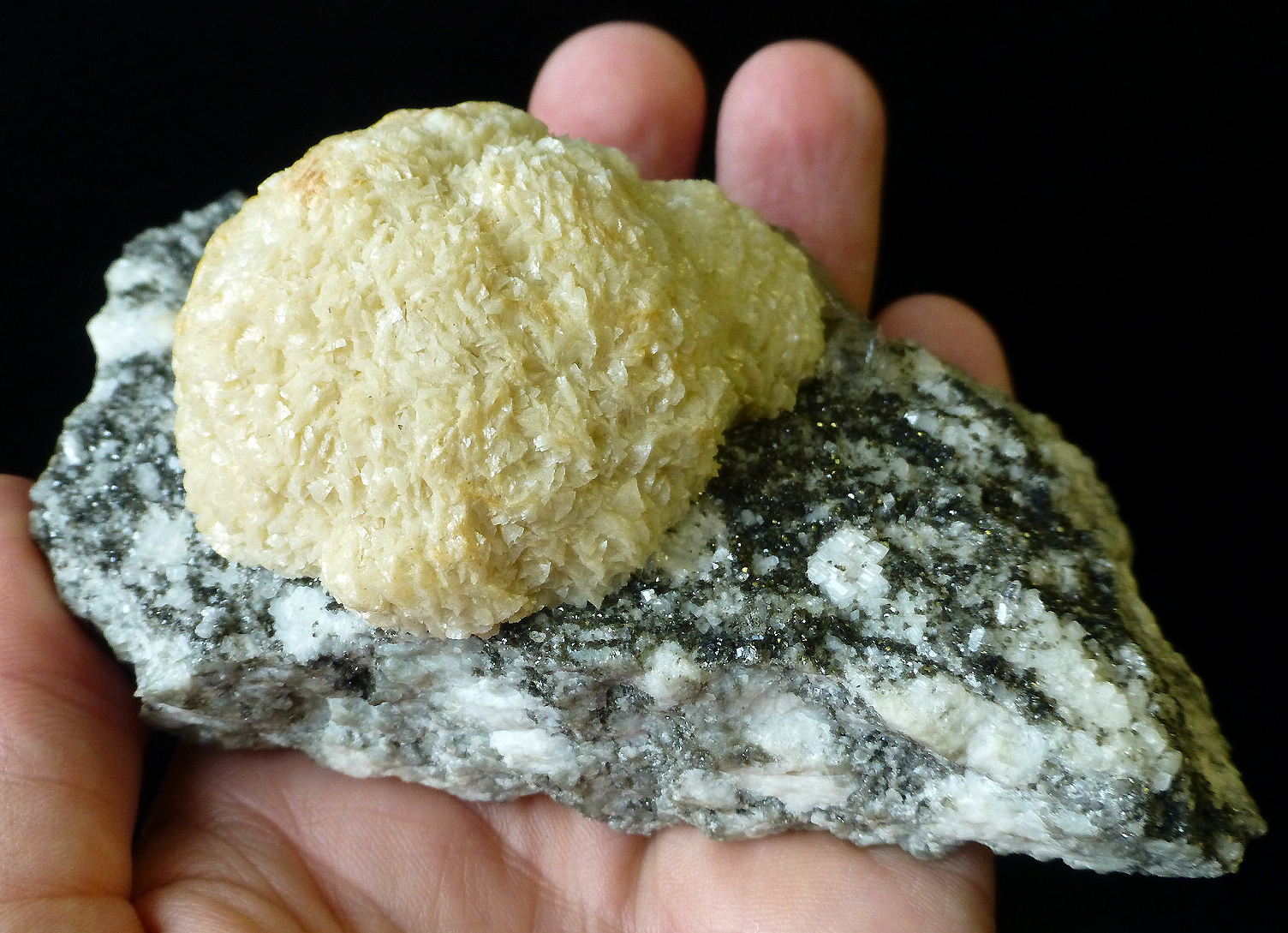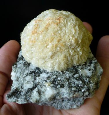Large ball-shaped aggregate of dolomite on granite matrix. From an old find in "Gaswerkstollen Grimsel". Beautiful arrangement!