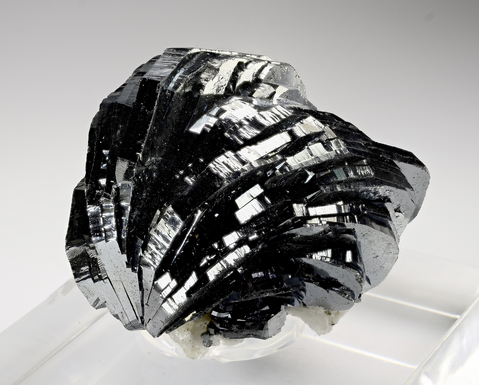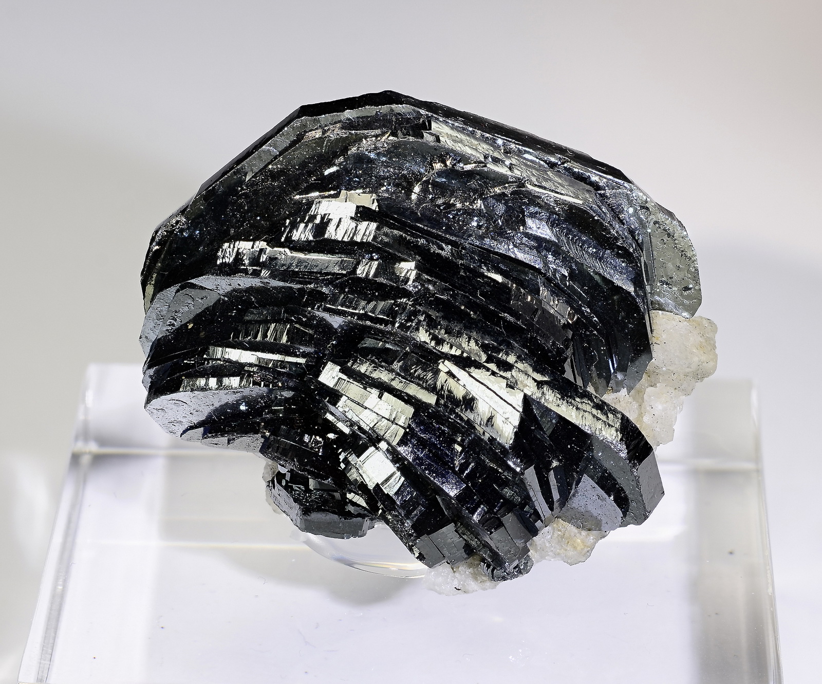 This is an amazing ironrose specimen from Fibbia, Gotthard mountains. The piece is a full floater and has small adularia crystals attached at the base. The stacked hematite crystals feature lovely bevelled edges and mirror luster on all sides. Great condition, and fantastic beauty on all sides!