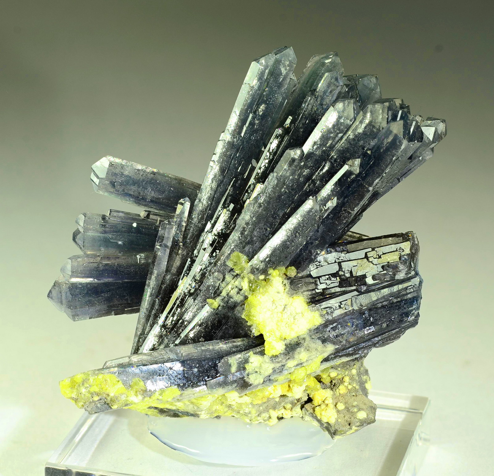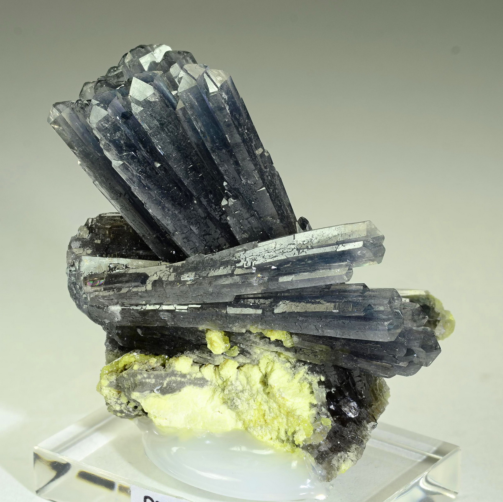 A beautiful spray of irridiated coelestine on sulfur. The terminations are all pristine and undamaged. Great aesthetics!