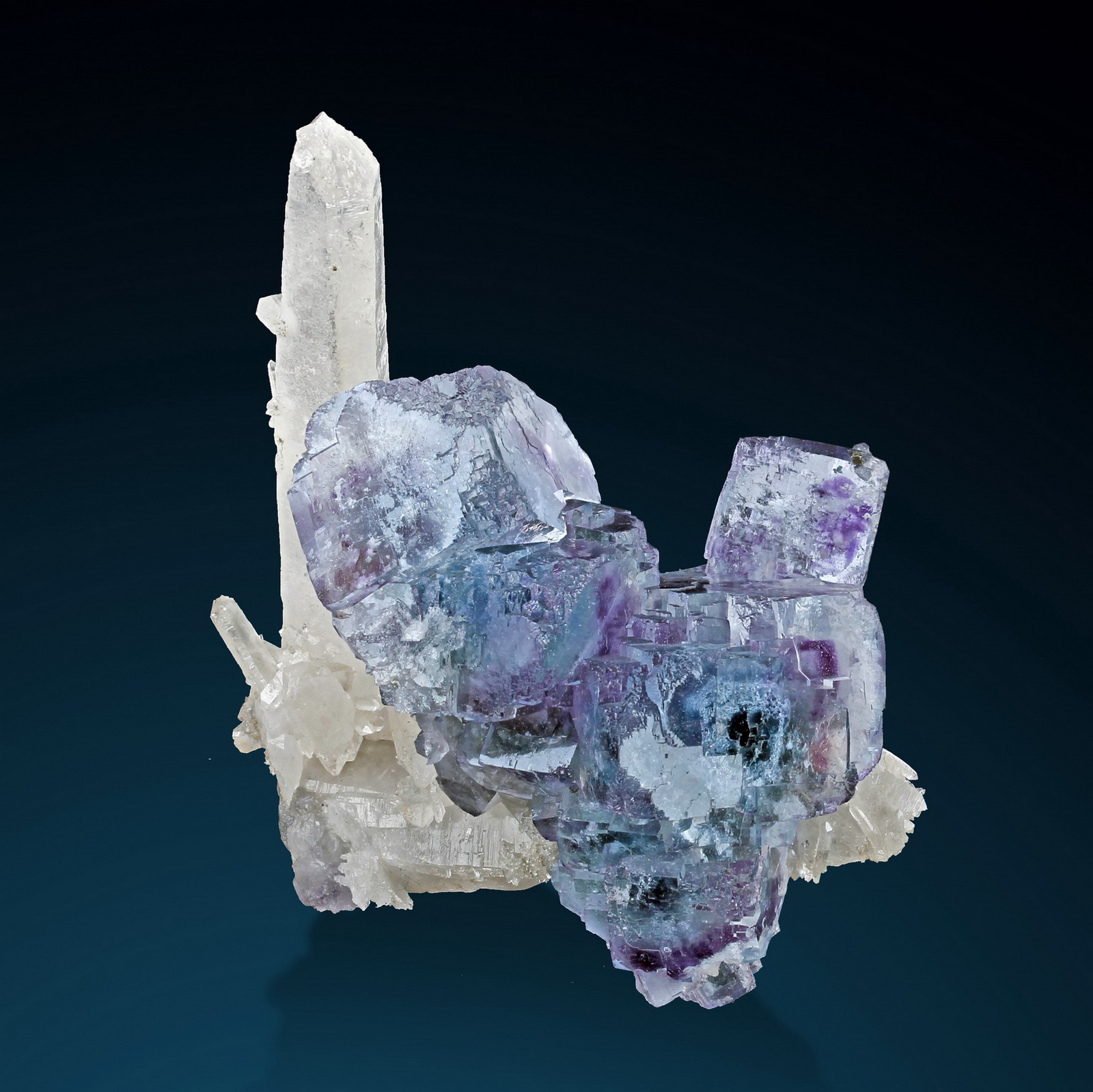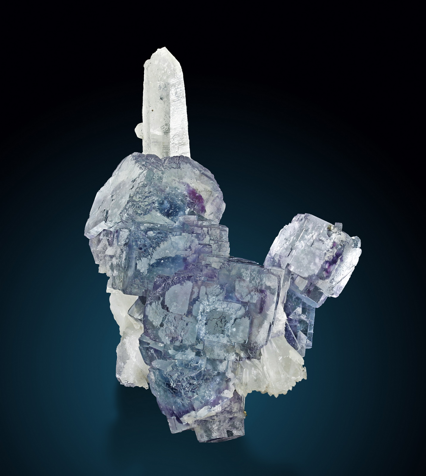 What a beautiful fluorite cluster perched on elongated quartz crystals! The fluorites have a blue core, purple phantoms around it, and a final clear layer at the outside. The specimen is a floater and in perfect condition all around.