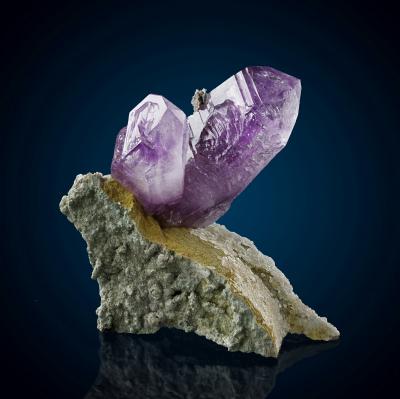 Two brilliant and lustrous amethyst crystals on a matrix covered by micro-crystalline epidote. No damage.