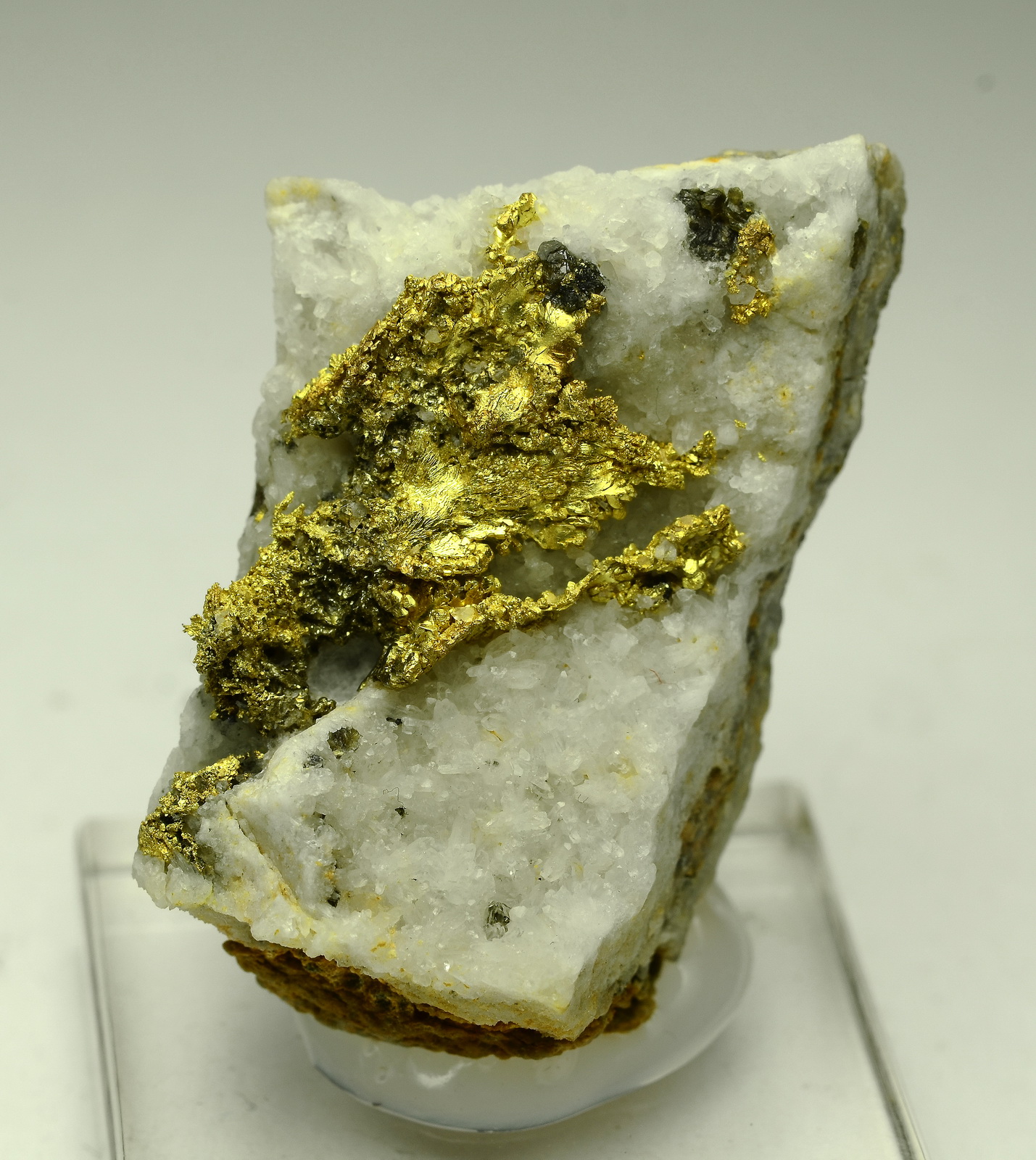 This specimen features sharp and lustrous gold leaves on a nicely crystalized quartz matrix. Small sphalerites are also present in some places. A lovely gold miniature from this classic European locality!