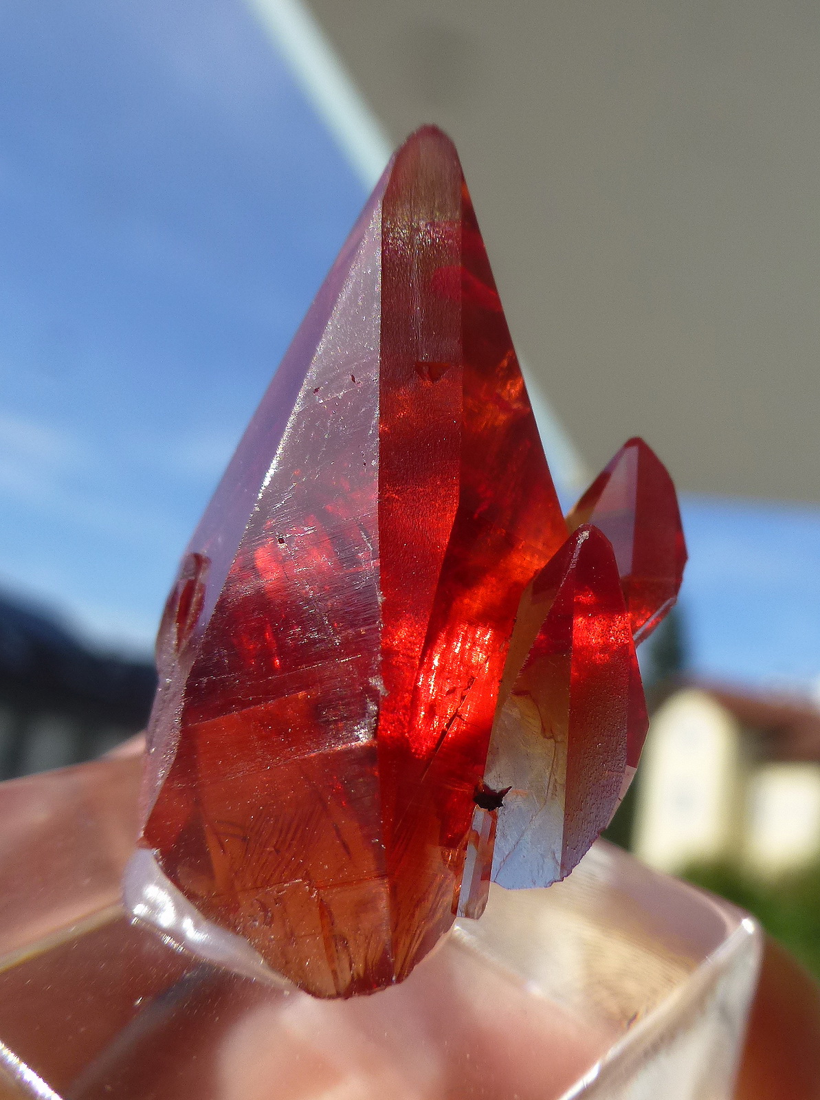 WOW! What a superb rhodochrosite crystal on wonderful quartz matrix! The crystal measures 3.9 x 3.5 cm and comes from the famous porcelain pocket. Some teraedrite, pyrite and galena crystals give a nice contrast. The crystal has fantastic luster and a deeply saturated red colour! The piece just glows, even from the distance!