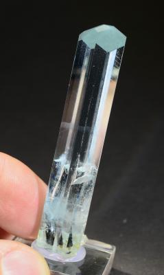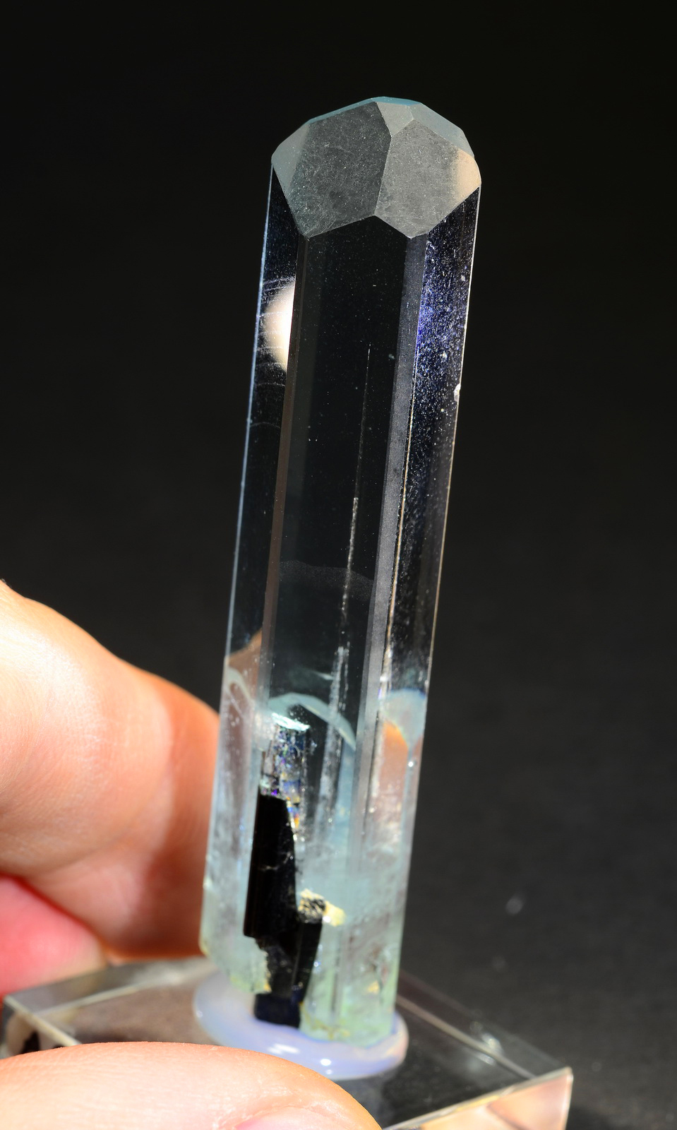 Gorgeous single aquamarine crystal, very brilliant and pristine all around, with a lovely schorl inclusion in the bottom section. The termination shows nicely bevelled faces, and the clarity is in fact amazing!