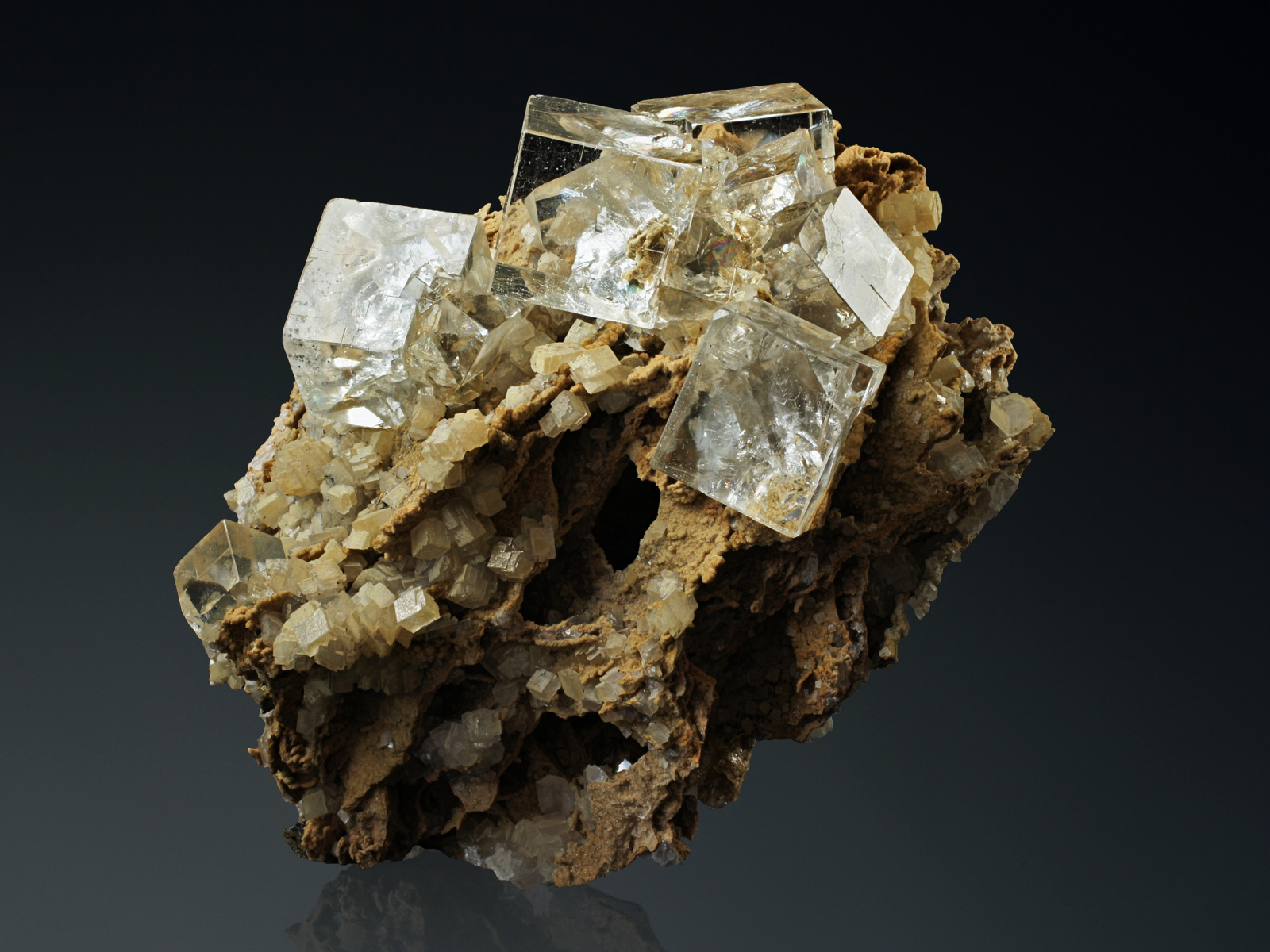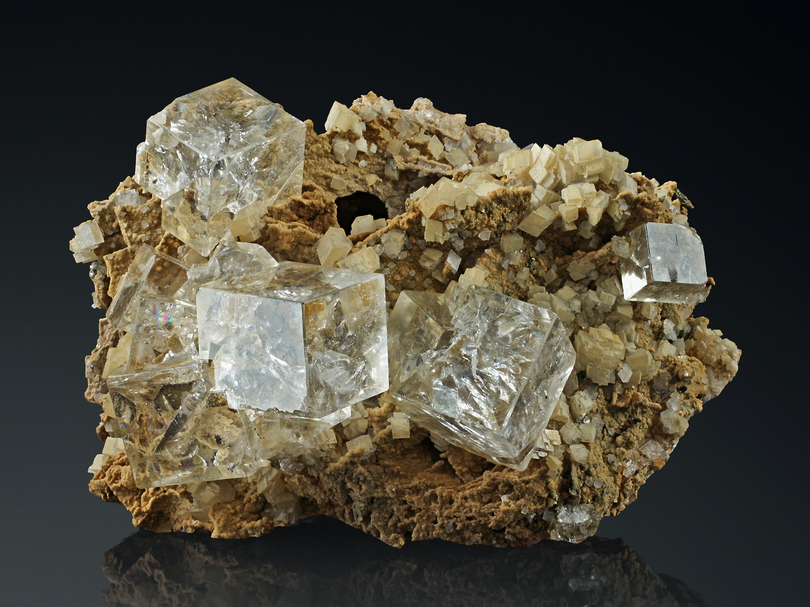 Sharp and incredibly clear fluorite cubes on calcite matrix. The clarity of the crystals is truly astounding, and the arrangement is very well balanced. One of the cubes has some little chipping along the back side edge, but it is barely visible from the front display angle. Gorgeous display and great visual impact!