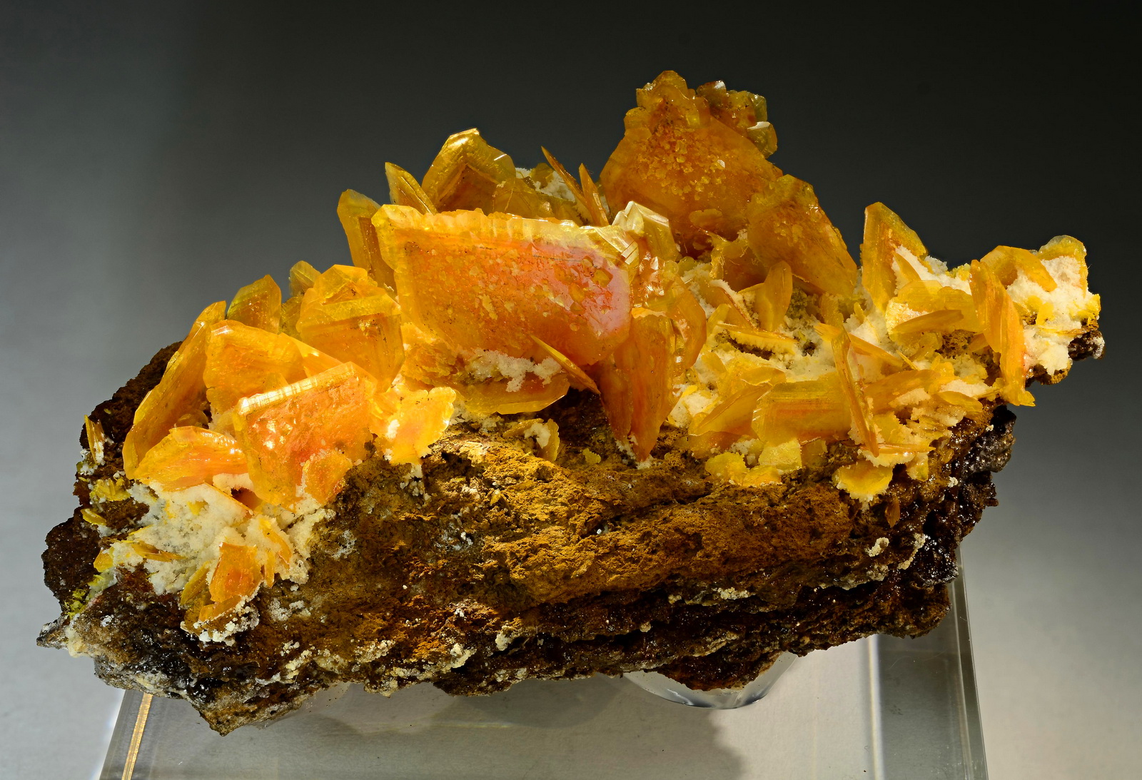 Deep orange wulfenite crystals to 22 mm across on gossan matrix. Note the reddish phantoms inside the crystals, which are probably due to vanadinite inclusions. Excellent specimen, no damage!