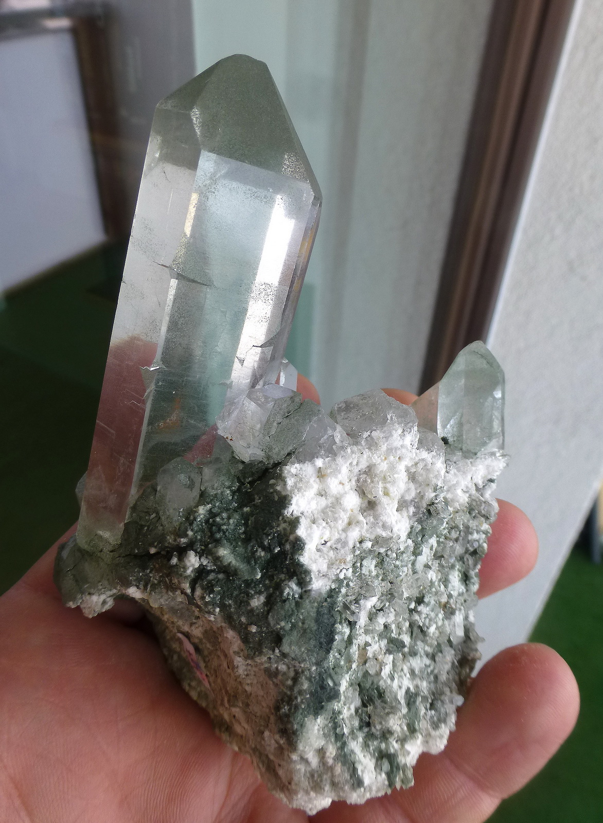 Great clear and elongated quartz crystals on matrix. Little bit of chlorite adds a typical alpine character. No damage.