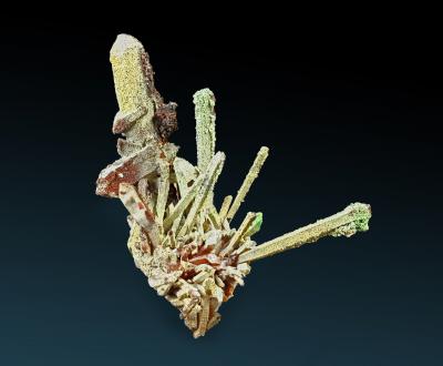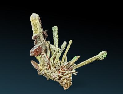 Elongated quartz crystals covered by limonite and malachite. Great condition and lovely aesthetics!