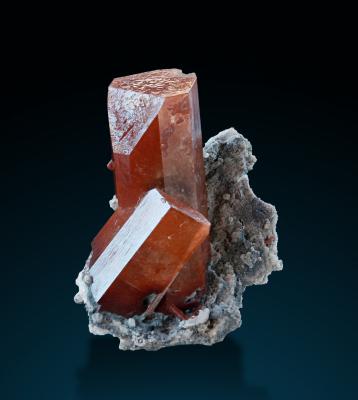 Perfect fluorite cubes on mica and feldspar matrix, featuring several bevelled faces on all sides. The crystals feature a beautiful and intense green colour, and truly rare shape!