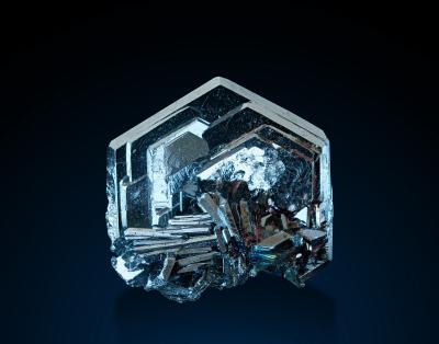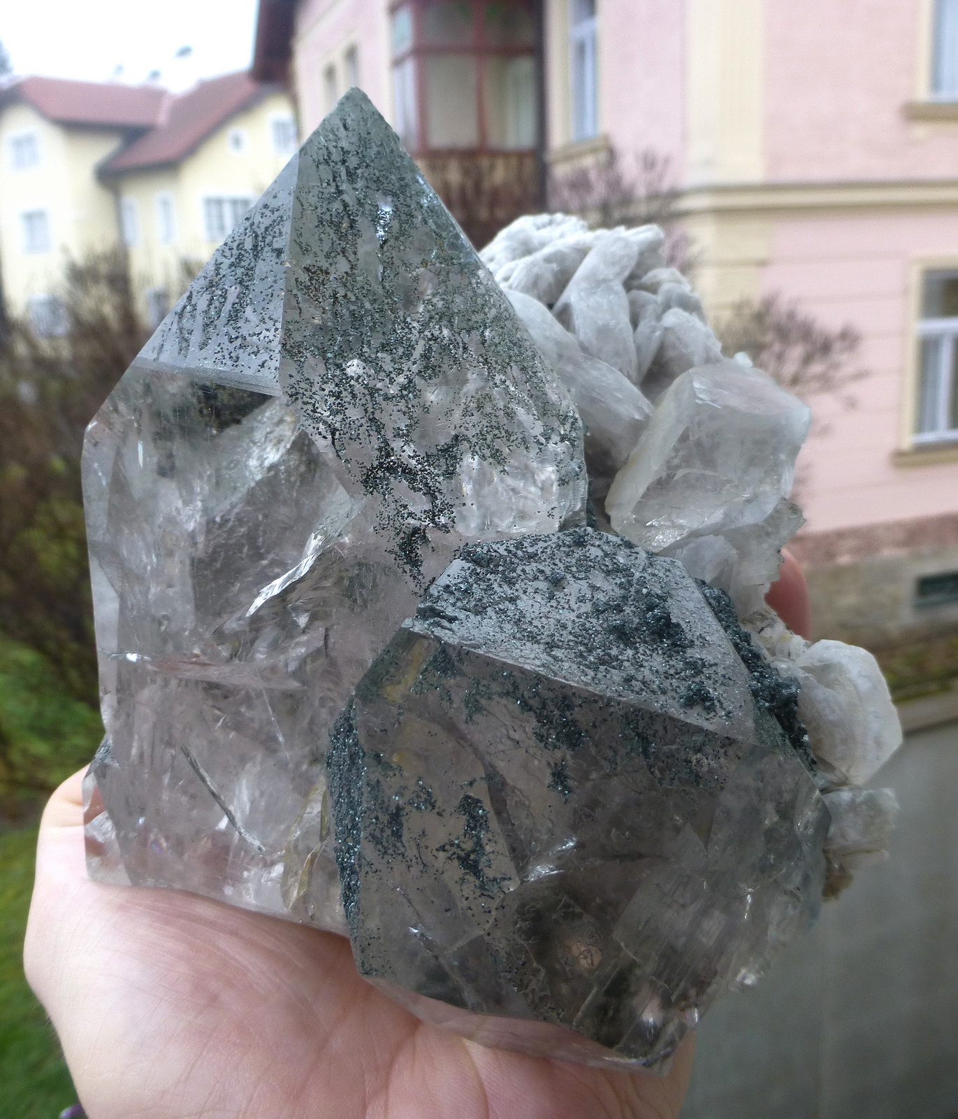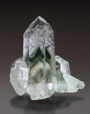 Striking chlorite phantom a a lovely quartz floater group. The back side of the crystal has a small chip (not on top, on the edge between pyramid and prism faces), otherwise the piece is in perfect condition all around. The side crystal on the lower right also shows an equally fine phantom in person, when displayed at another angle.