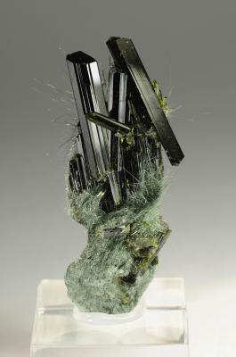 WOW! A lovely cluster of epidote crystals perched on byssolite matrix! Note, the epitote on the right is even doubly terminated. Excellent aesthetics and condition, one of the finest miniatures i have seen on the open market for a long time!