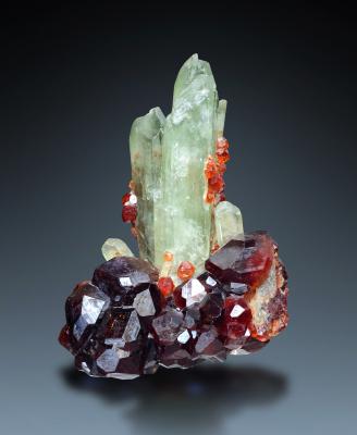 WOW, what an amazing piece! An elongated diopsite is placed upright in a "matrix" nest of sparkling garnets. Excellent miniature!