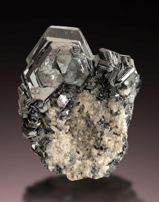 Uncommonly thick cluster of hematites resting on white adularia crystals. Great contrast and aesthetics!