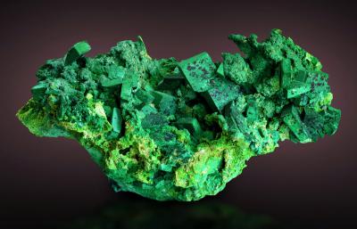 Sharp and very well formed malachite ps. azurite crystals on bayldonite matrix. Another unknown black species is also present on the malachite crystals. Very distinctive, classic Tsumeb style!