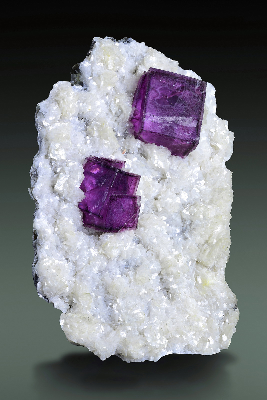 Sharp and deep purple fluorites perched on white dolomite matrix. Great condition and visual impact!