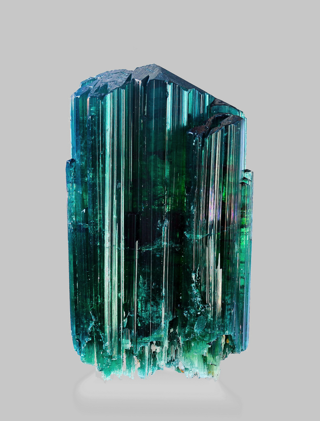 This is a classic Santa Rosa tourmaline featuring the distinctive green and blue hues. It is a superb composite cluster of several crystals in parallal growth. The top terminations are nicely stepped and all in pristine condition, the bottom termination is naturally etched and also fully crystalized. Great colours and shape!