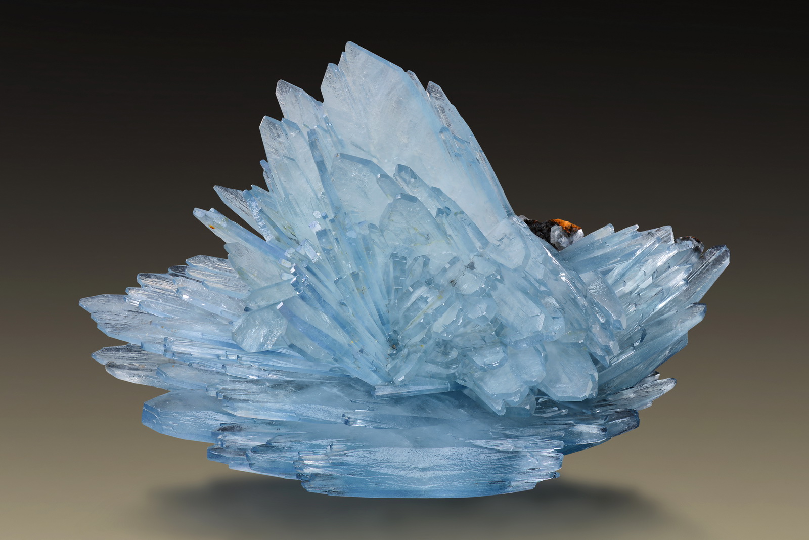 Supperb flower spray of blue barite from the recent finds in Nador, sitting on a small piece of gossan matrix. This specimen features the best luster and colour found, and it is in excellent condition all around. It is very 3-domensional and showy on all sides!