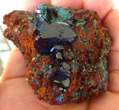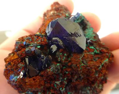 This azurite specimen comes from Sardinia and features deep blue and razor sharp azurite crystals to 19 mm perched on matrix! The quality is great and very uncommon for this locality. There is no damage on any of the crystals, and some malachite attached at the side provides a very nice colour contrast!