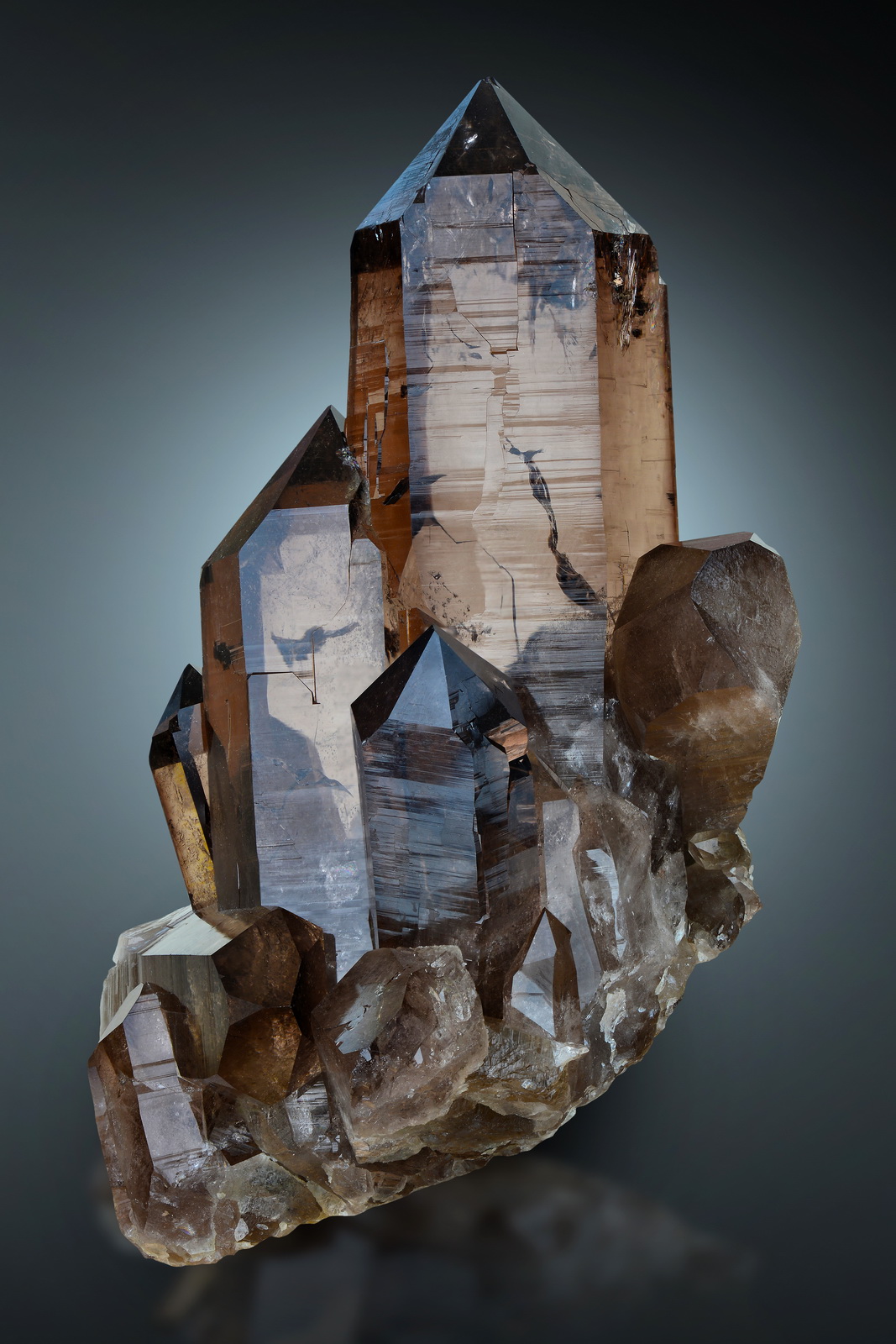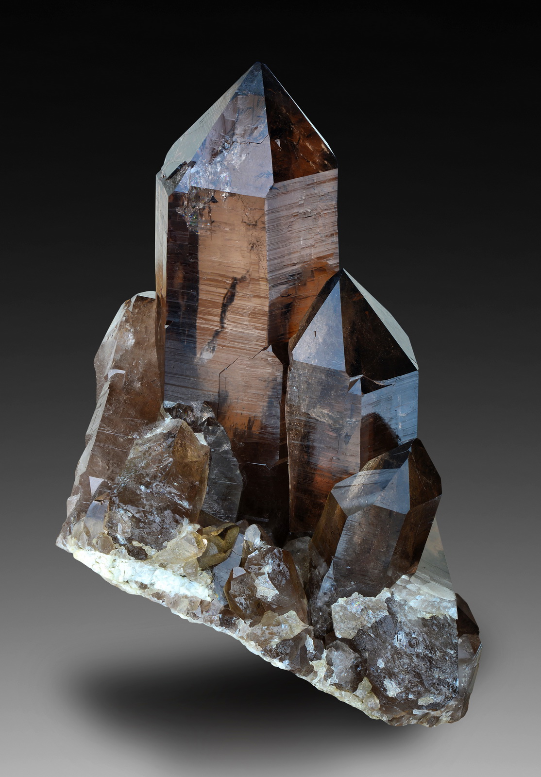 Superb smoky quartz crystals in a wonderful cabine sized cluster. Needless to say, this piece comes from the famous Rufibach pocket in Grimsel area, the quality speaks for itself! It has not been surpassed for decades, and still sets the standard for any smoky quartz crystals in the world. There is one little chip (about 2mm wide) present on the crystal tip, it goes to the back side and is barely noticable from the main display angle. The aesthetics and composition of this piece are truly amazing!
