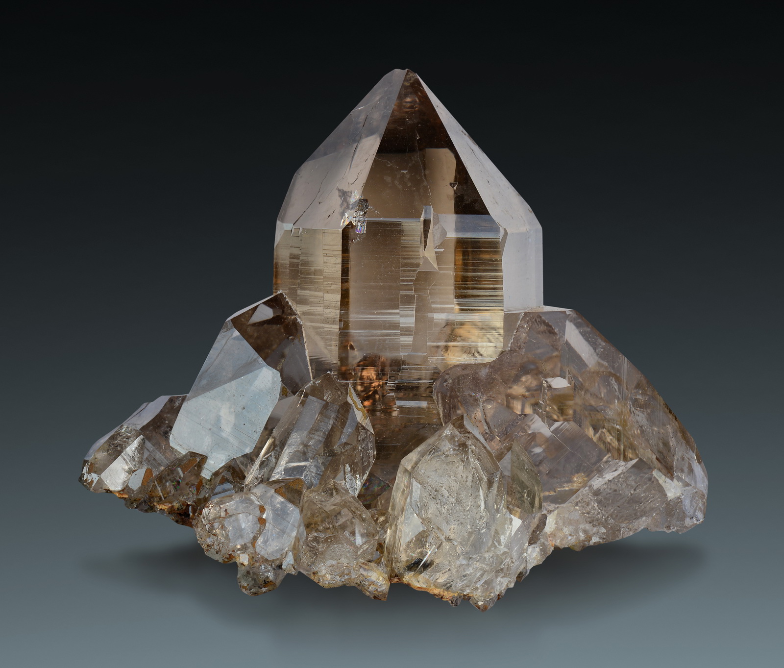 A thick and sturdy, still fully clear smoky quartz crystal encompassed by half a dozen smaller ones. It features a very pleasing bright smoky hue, so typical of this locality. Bottom side is fully crystalized. No damage.