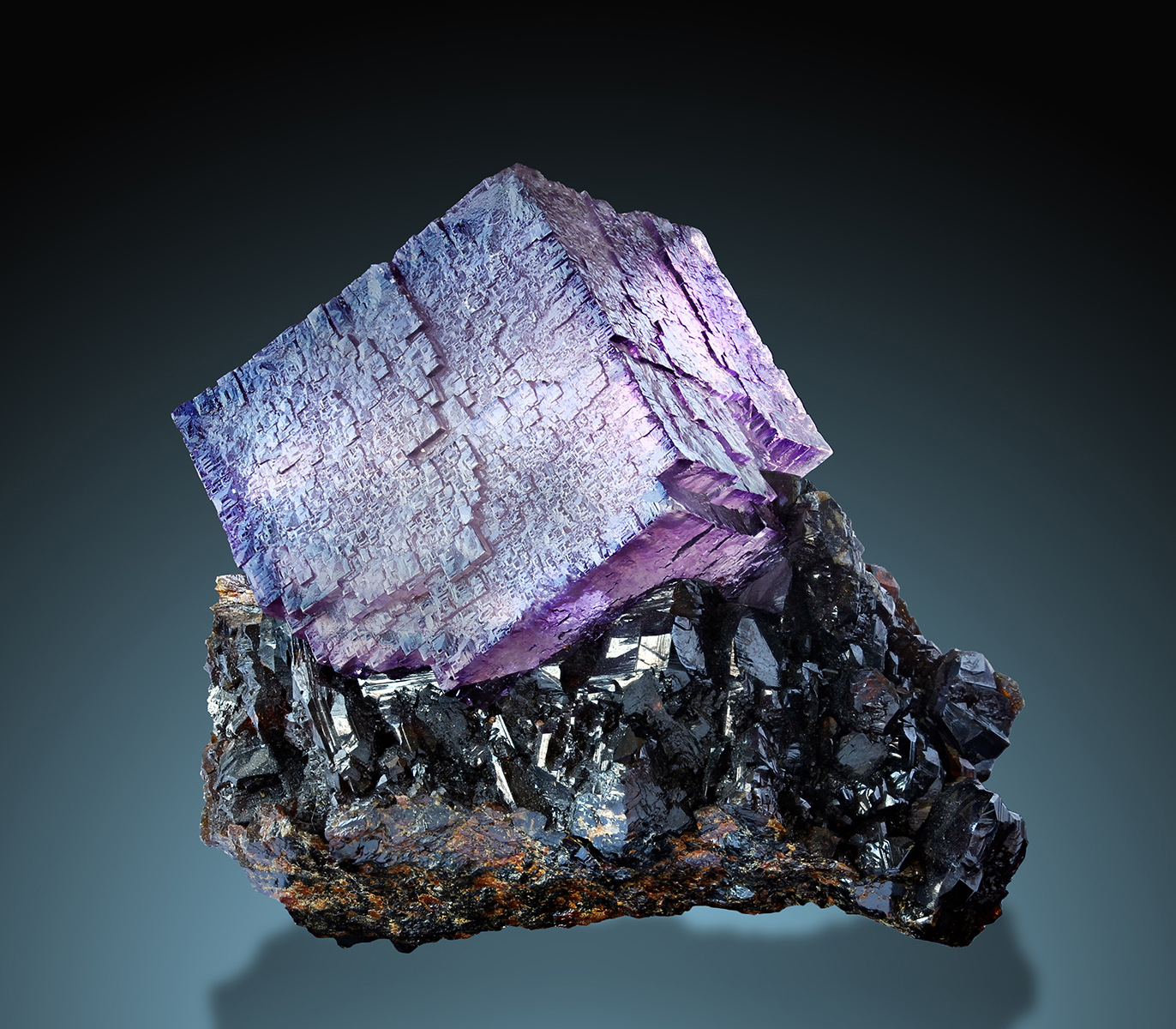 The main crystal is 29mm on edges. The faces show a really eye-catching texture, which seems to consit of hundreds tiny squares - all of them very glossy. The center is very light, just a touch of lavender. Along the edges you can see a sharp concentration of purple color. The crystal is perched on dark, lustrous sphalerite, which gives a lot of contrast and great visual impact to this excellent specimen.