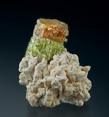 The matrix is nearly formed like a ball by tiny Feldspar crystals – they are white with touch of yellow and a significant dark stripe in the middle – even for a feldspar collector this would be an exciting specimen. On it an etched Tourmaline, etched and crystalized again – same effect as Volodarsk Heliodor. That is very special – usually an etched crystal would not be on Feldspat, the etching process would bring it off the matrix. Nearly all etched Tourmalines (and also these famous etched Auqas) from Brazil are always single crystals and not on matrix. The crystal (about 40 mm tall) shows uncountable sharp faces which are all highly lustrous, very uncommon habit for tourmaline. Also remarkable is the colour. At the base it is yellow to light green and at the top is shows cognac like colour, nearly orange. Yellow and orange are most rare for Tourmaline! Overall a great rarity, very unusual and great visual impact, very showy in several positions, colourful – an eye catcher and - although I did a good job with photography - it is better in person.