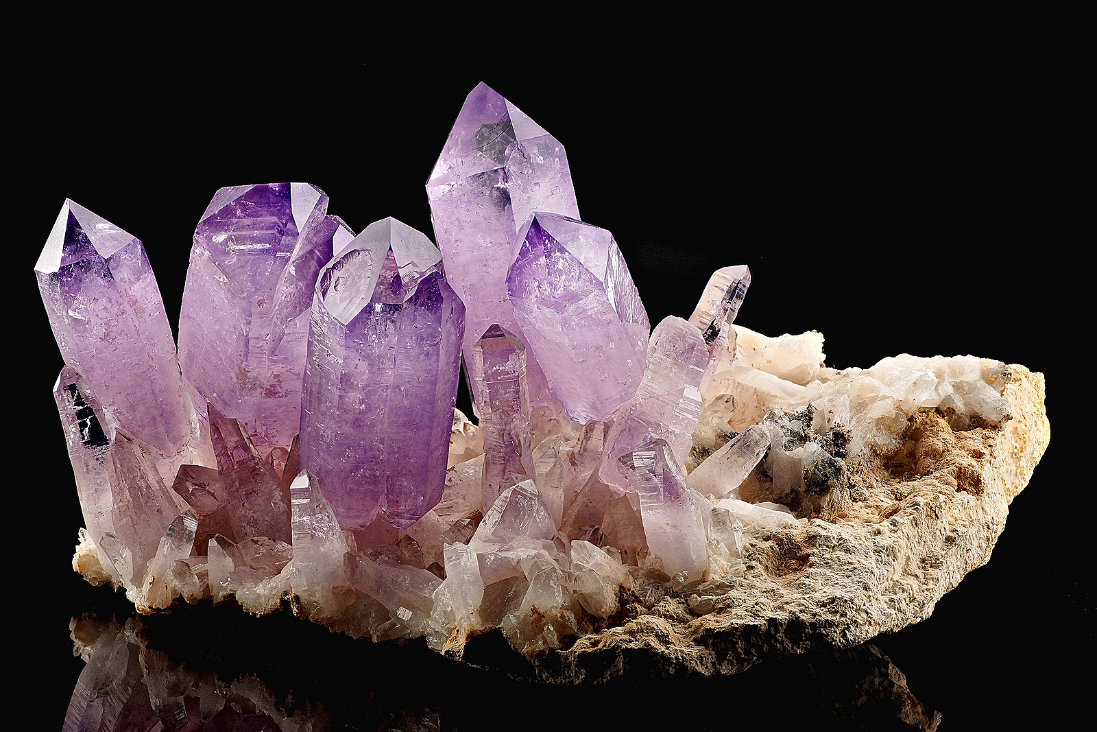 A gorgeous assemble with very glossy, sharp terminated and gemmy amethyste crystals. They are all freestanding and the color is very good - much better then common material from the area. A further important indicator is the zepter habit of most amethyste crystals. Looks great in various positions. No significant damages to report. Ex Dr. Dallinger coll.
