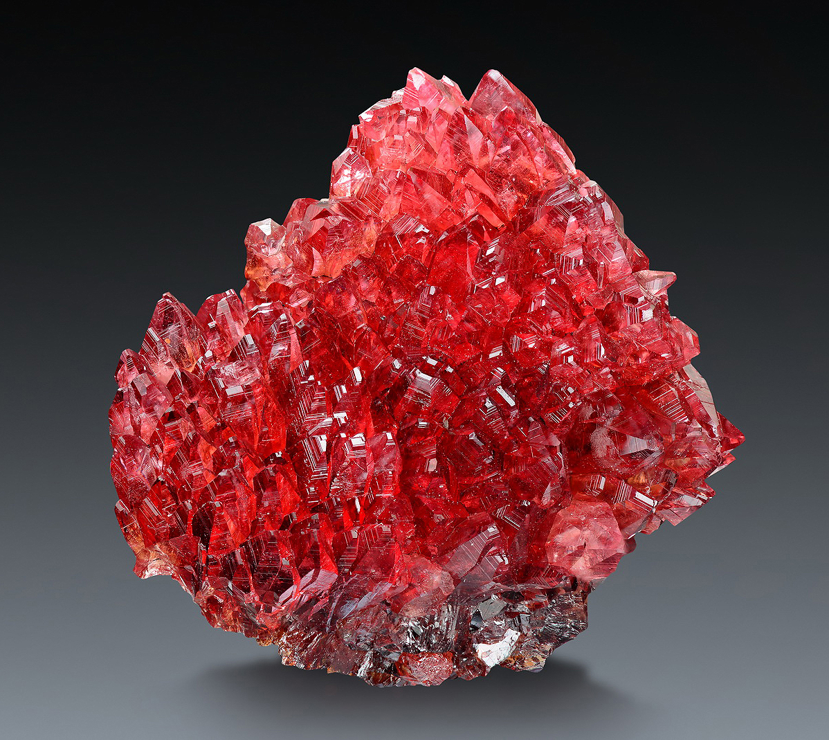 Blood red, gemmy crystals formed a pyramidal-like assemble. The startiation of each crystal is simply breath-taking, the specimen shows outstanding quality and the photo don´t do justice to this marvellous specimen.