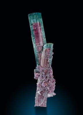 Great classic specimen! The inter-grown crystals show pink phantoms and blue-green zoning along end-points and edges. Where the crystals collide you also can see a group of violet lepidolite, which gives even more color to this impressive group.
