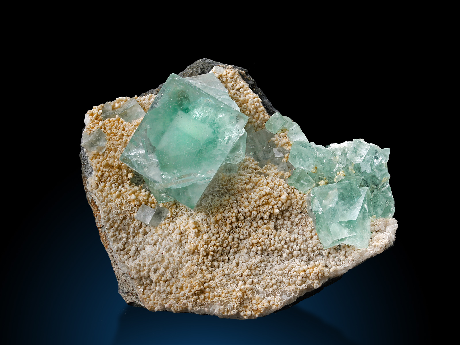 A huge (34mm one edges), sharp termianted and highly lustrous fluorite crystal set on light matrix. The cube is completely exposed, it shows a sharp internal zoning. Contrast and quality are just amazingly delicate! No significant damages to report.