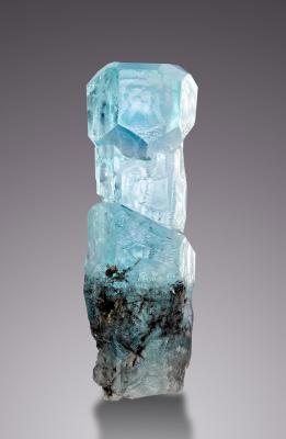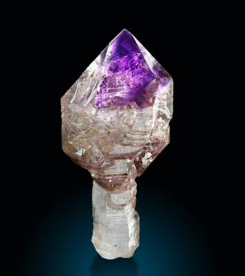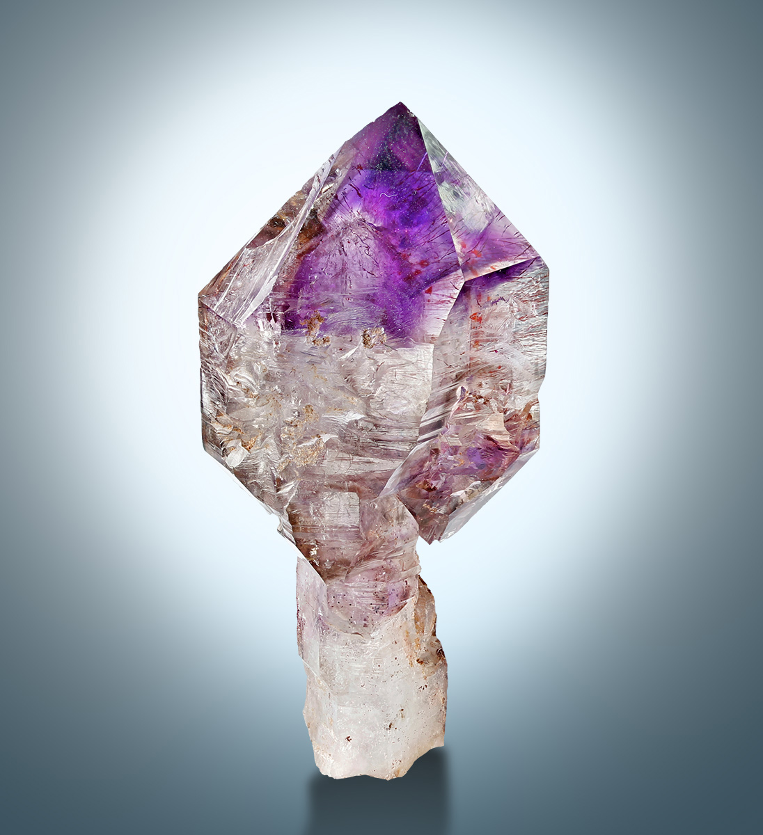 A superb zepter from this more uncommon locality. A low number of specimen reached the market during the last few years, but unfortunately most material shows really bad damages. This one is in excellent condition, it shows wonderful luster and and excellent color. At the top you can see dark violet color, in the middle there are more smoky tones. Looks great in each angle, perfect quality all around!