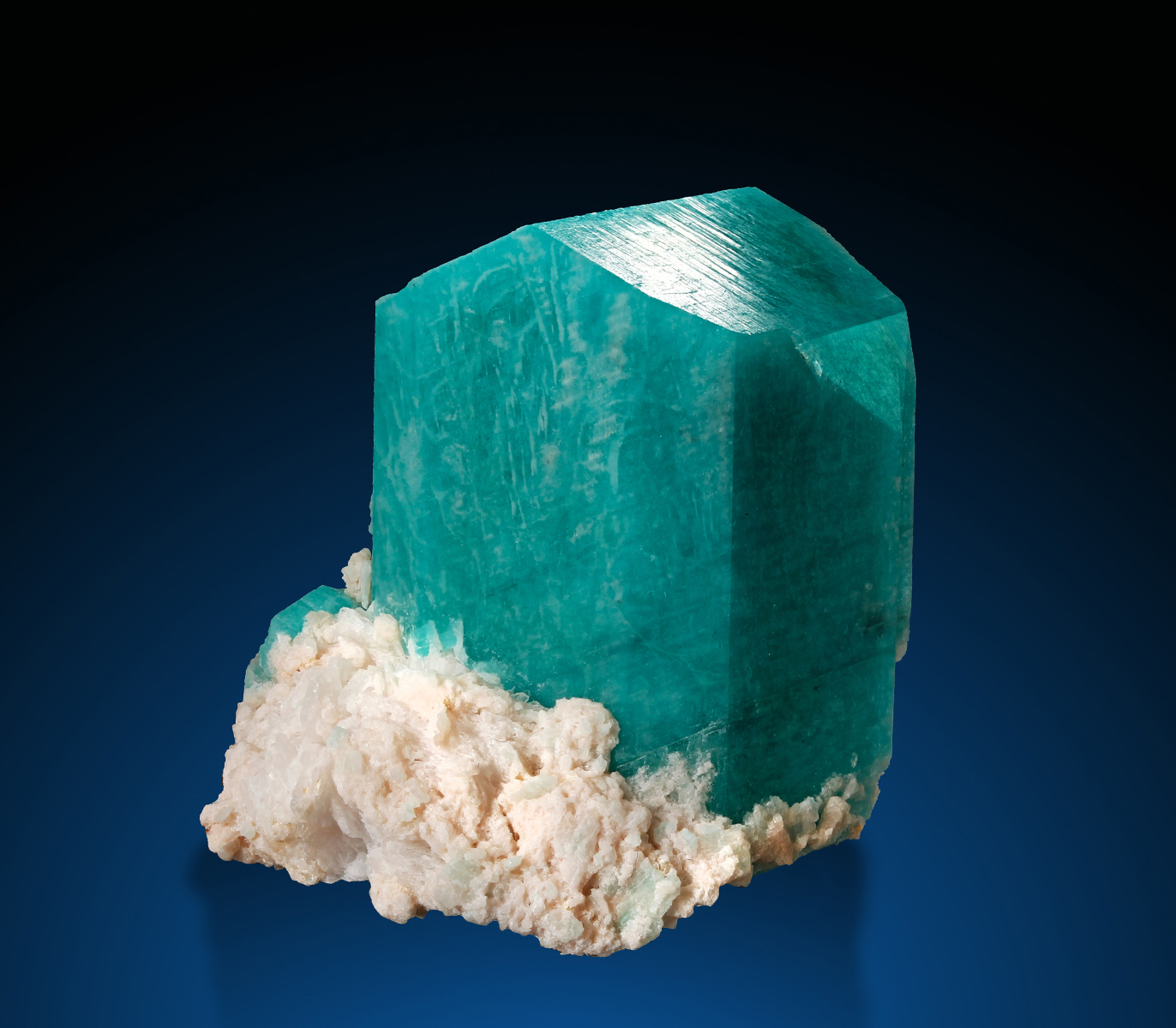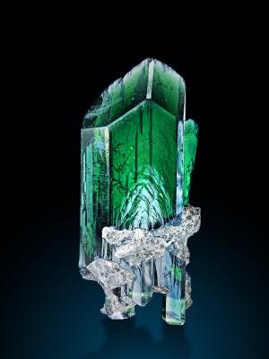 A sharp terminated, lustrous intense colored crystal raisning up vertically on light, nearly white matrix. A very fine sample fom this famous classic locality. No significant damages to report.