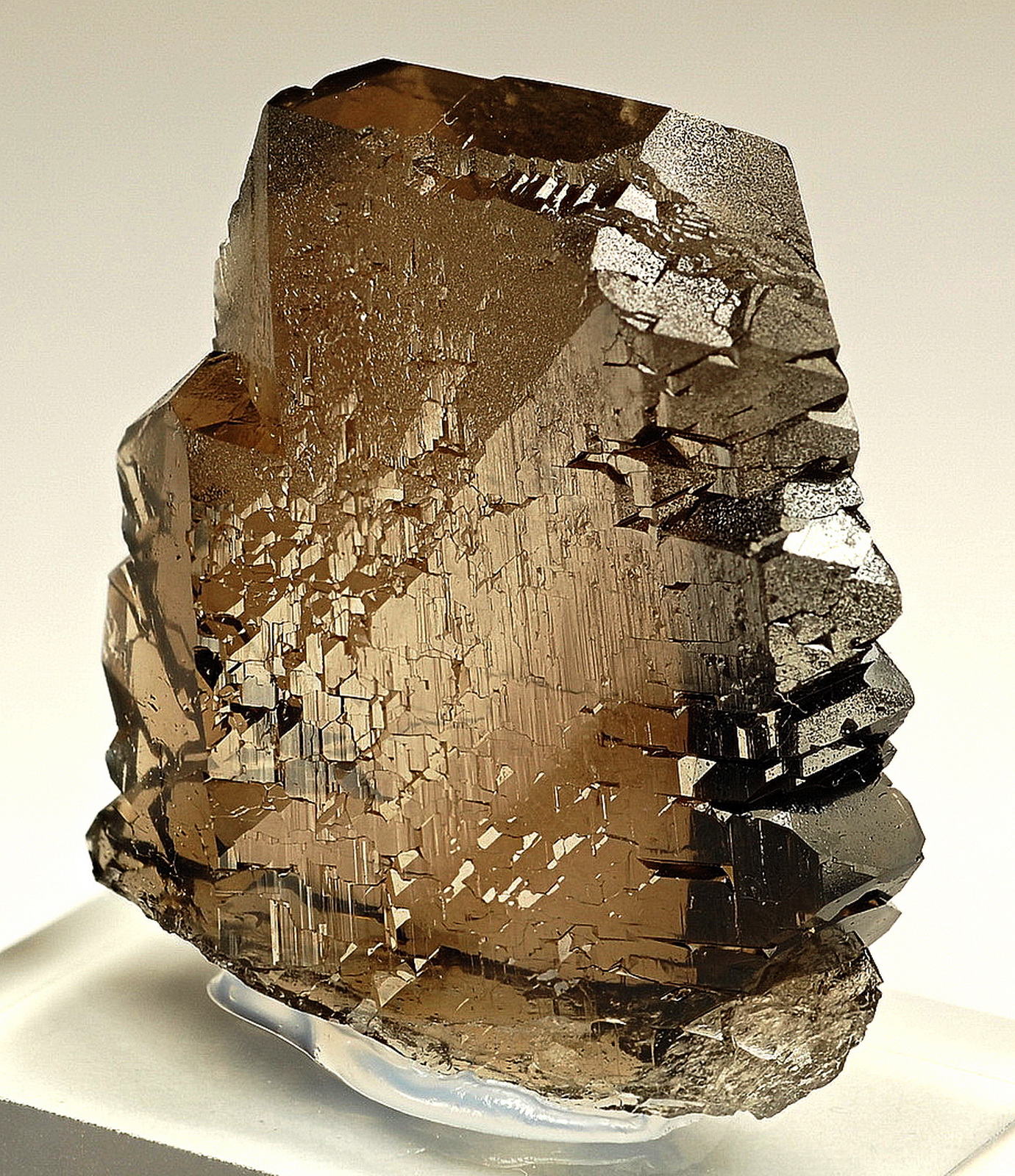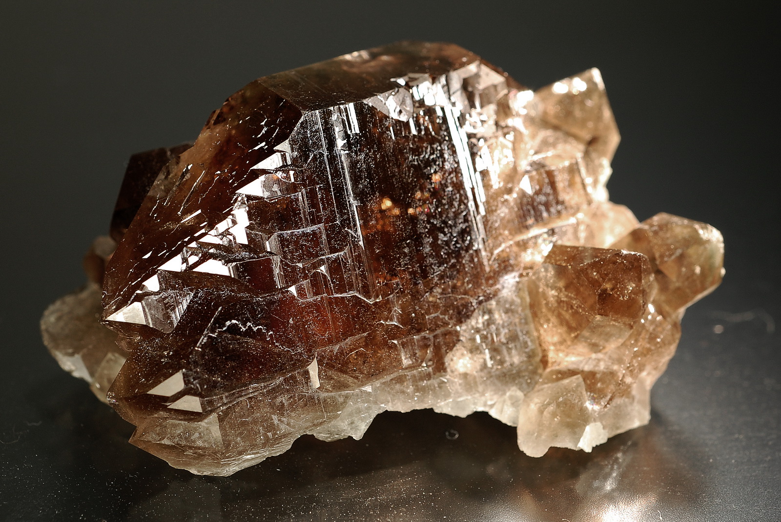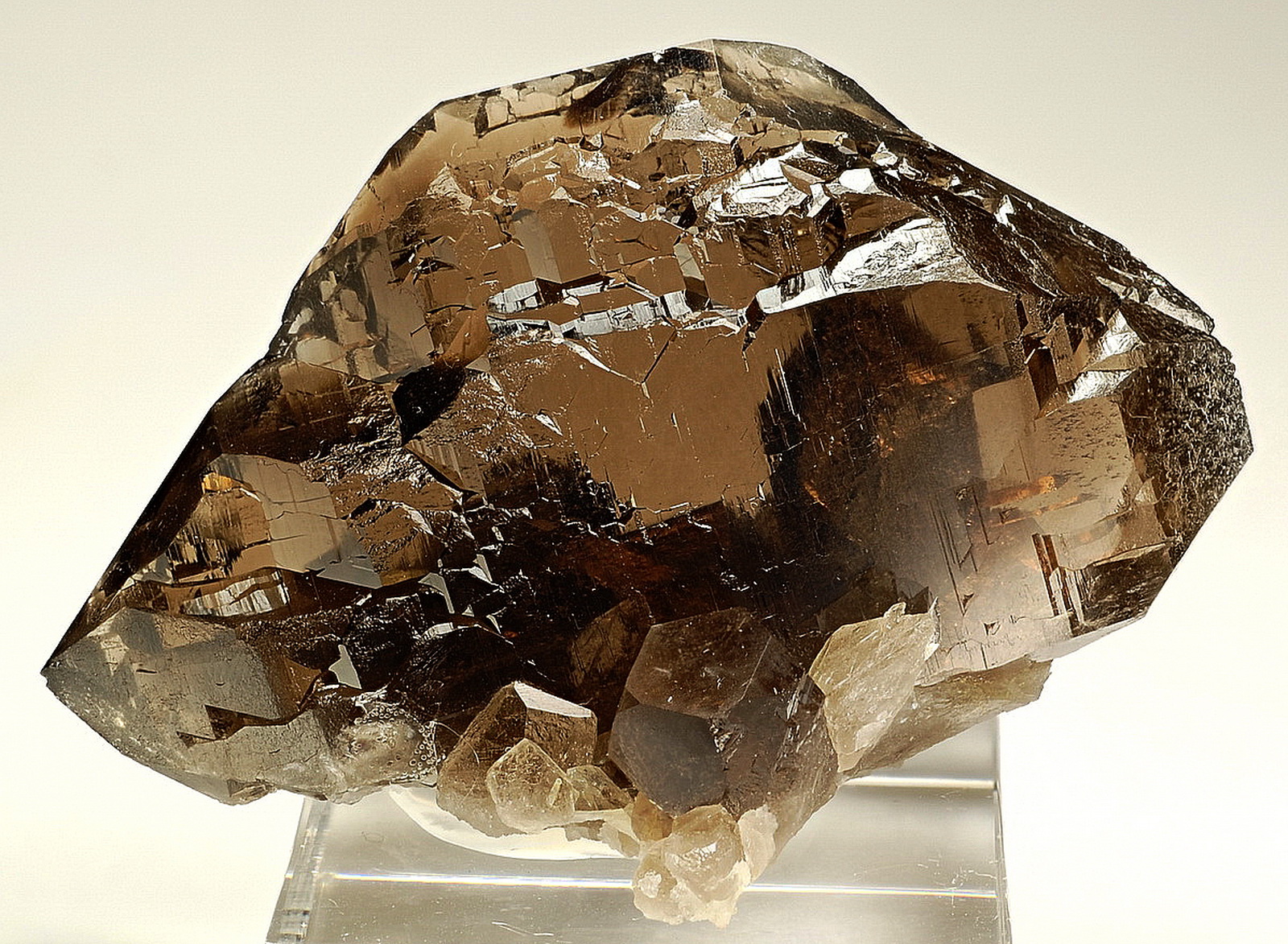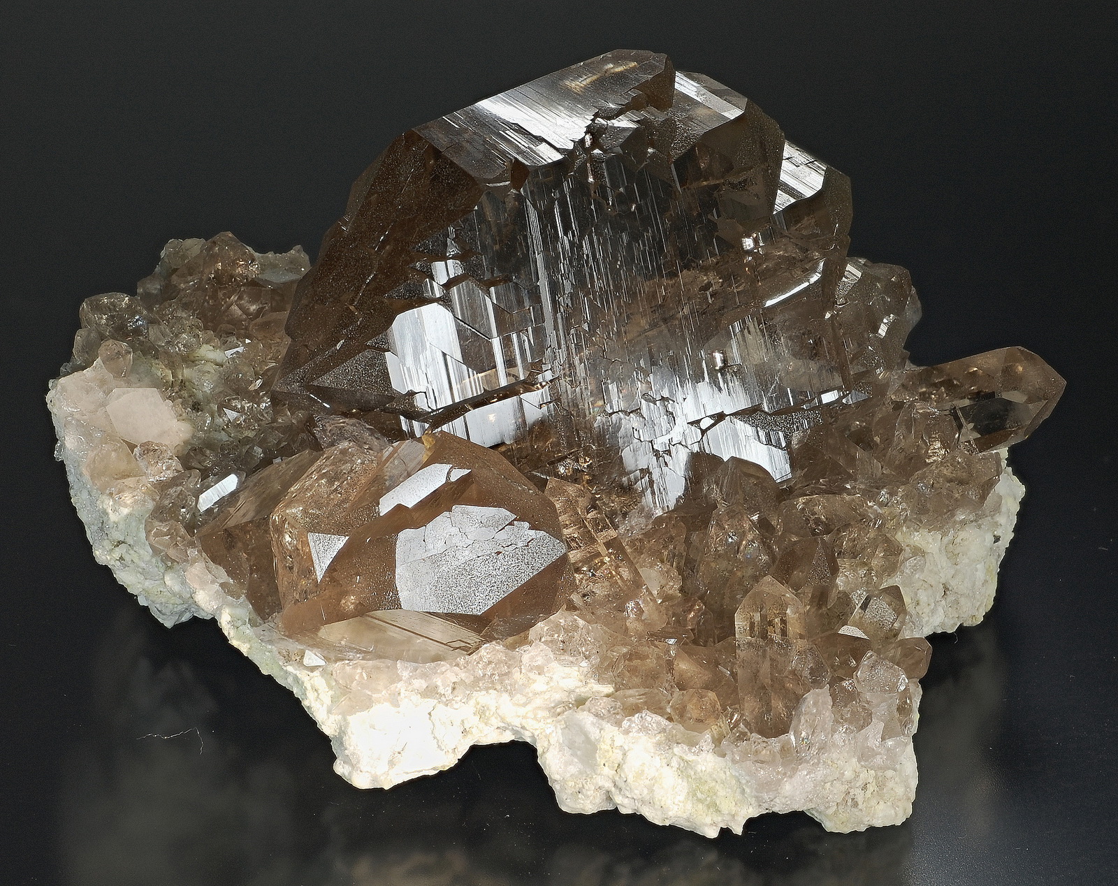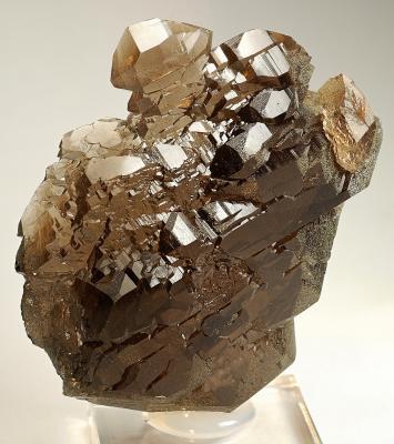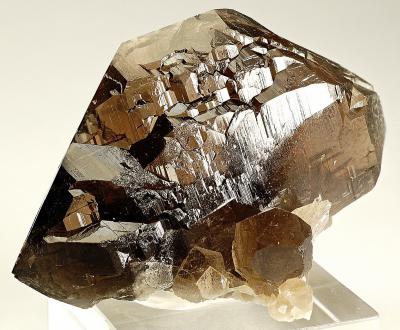 This is a top quality smoky gwindel resting on smaller regular smoky crystals. It features amazing colour, transparency and luster. The bottom side is fully crystallized. Tiny chips are present, but they are very small and no detraction. Just a superb piece!