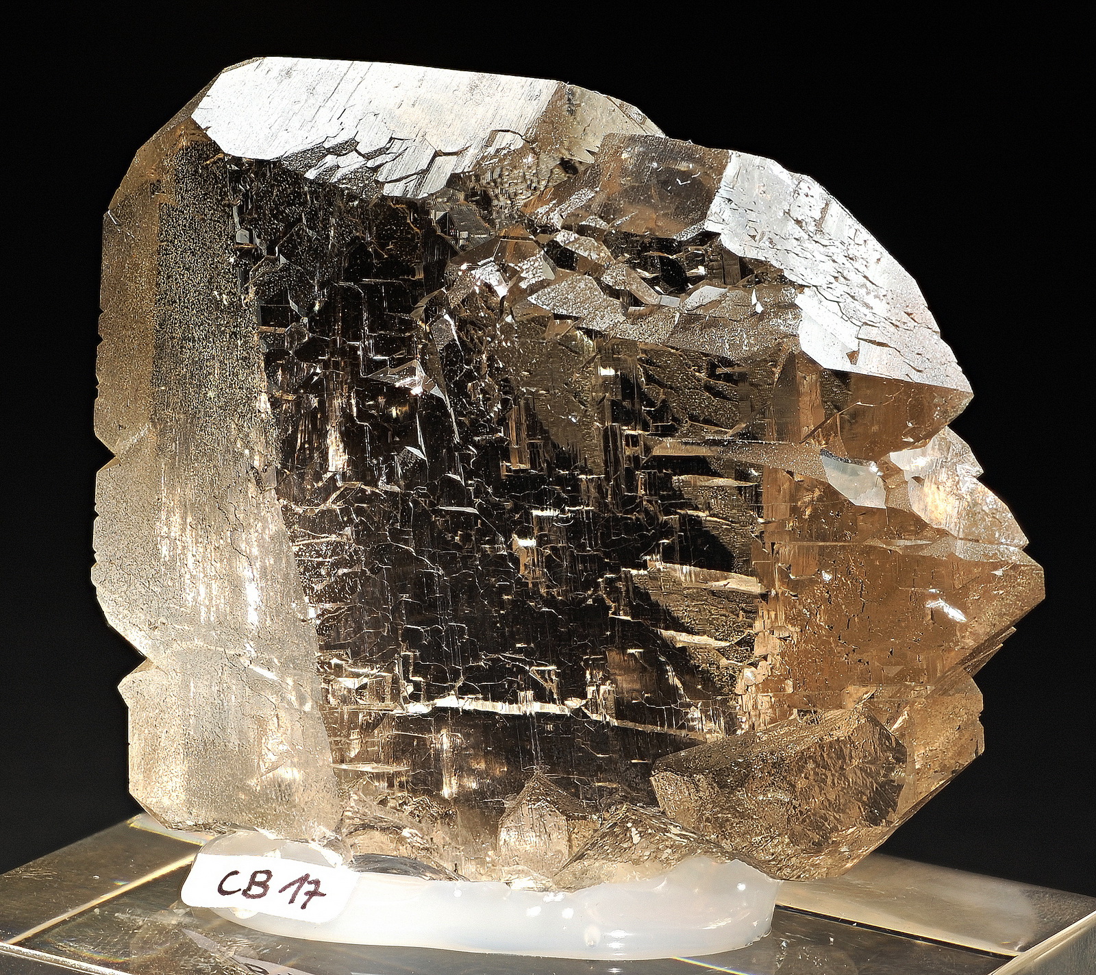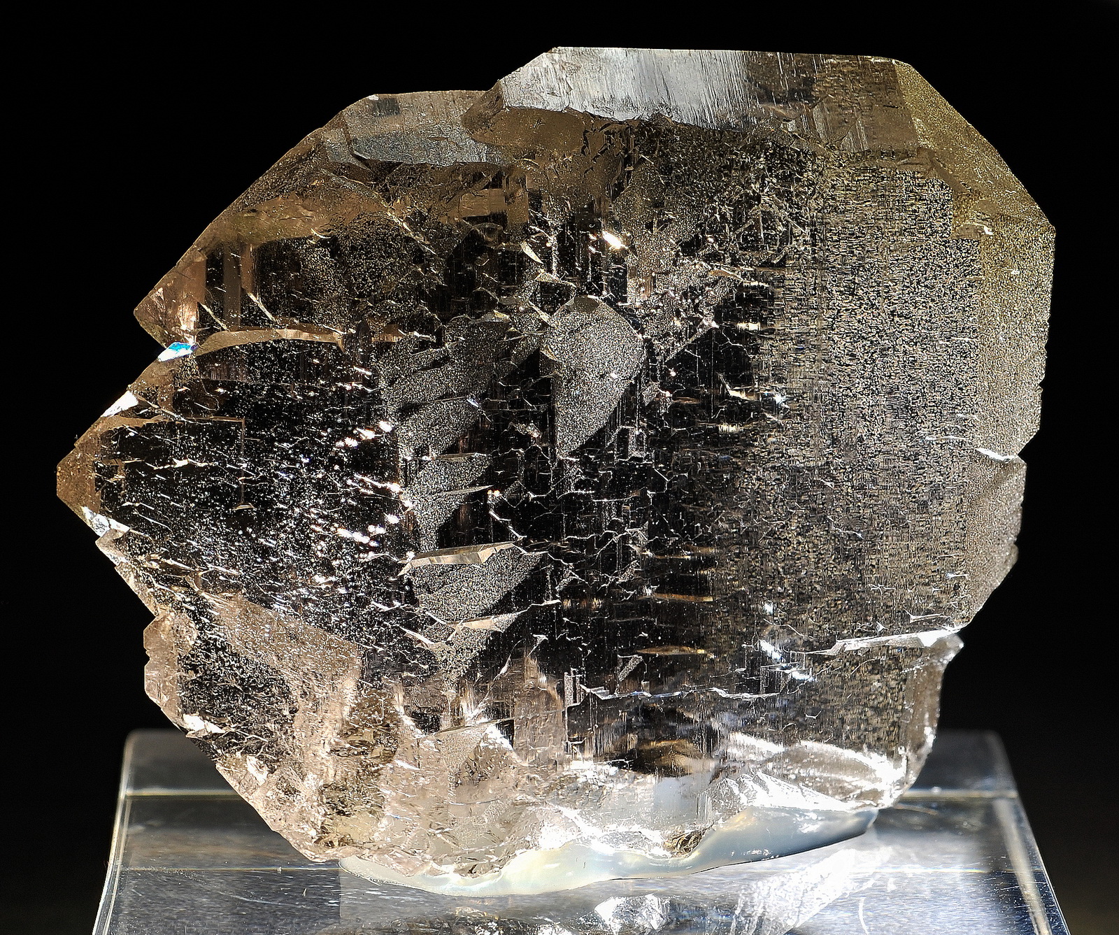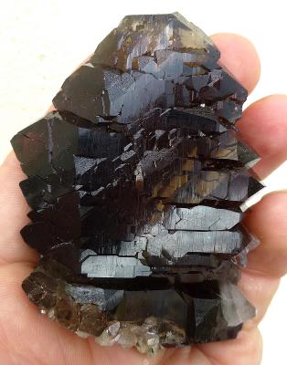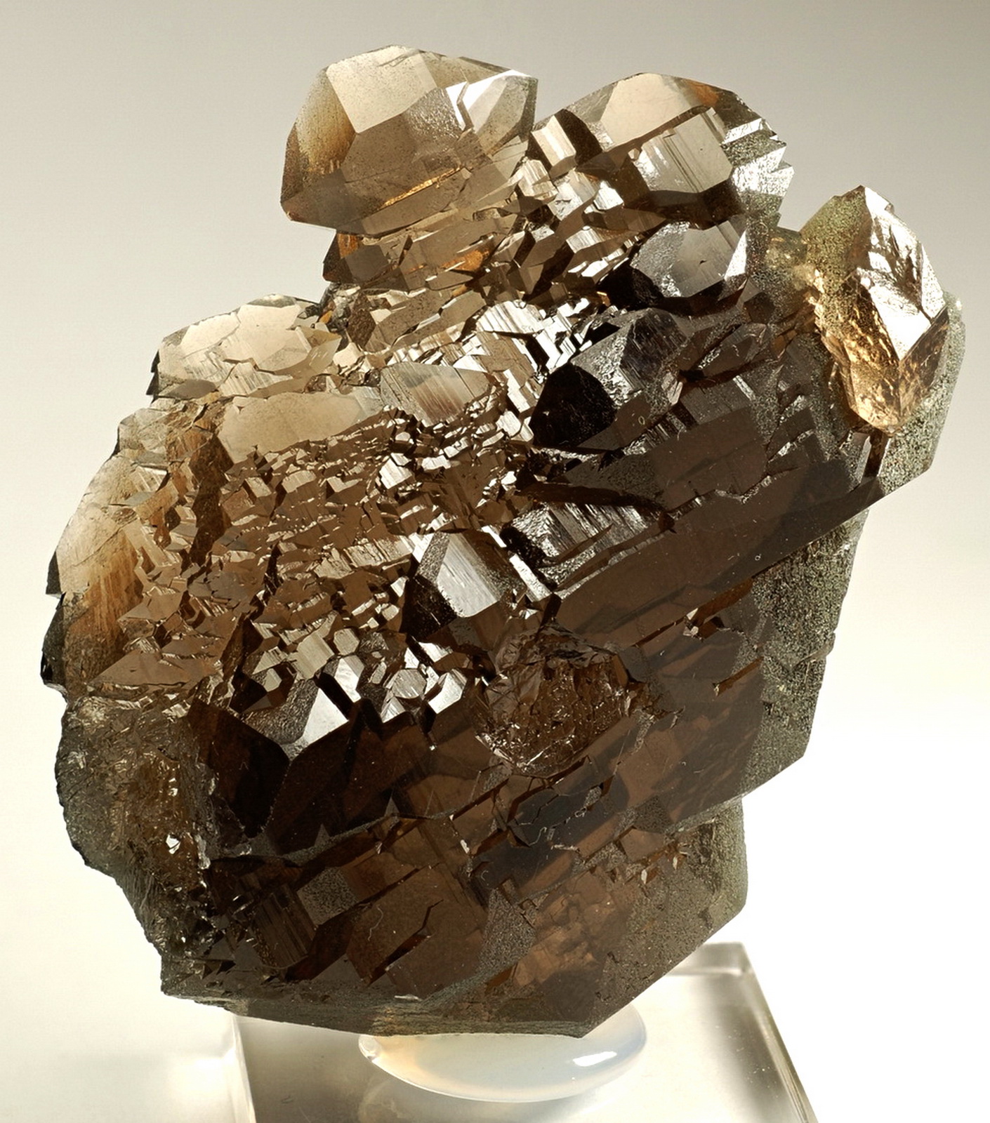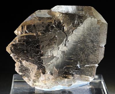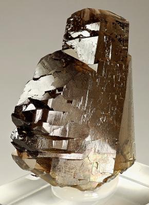 This is a top quality smoky gwindel resting on smaller regular smoky crystals. It features amazing colour, transparency and luster. The bottom side is fully crystallized. Tiny chips are present, but they are very small and no detraction. Just a superb piece!