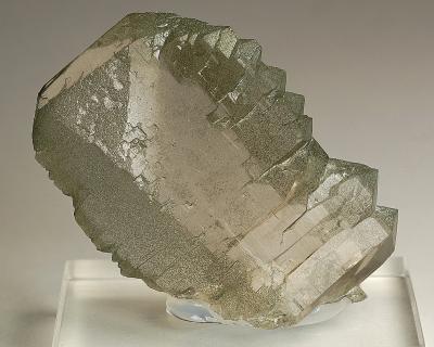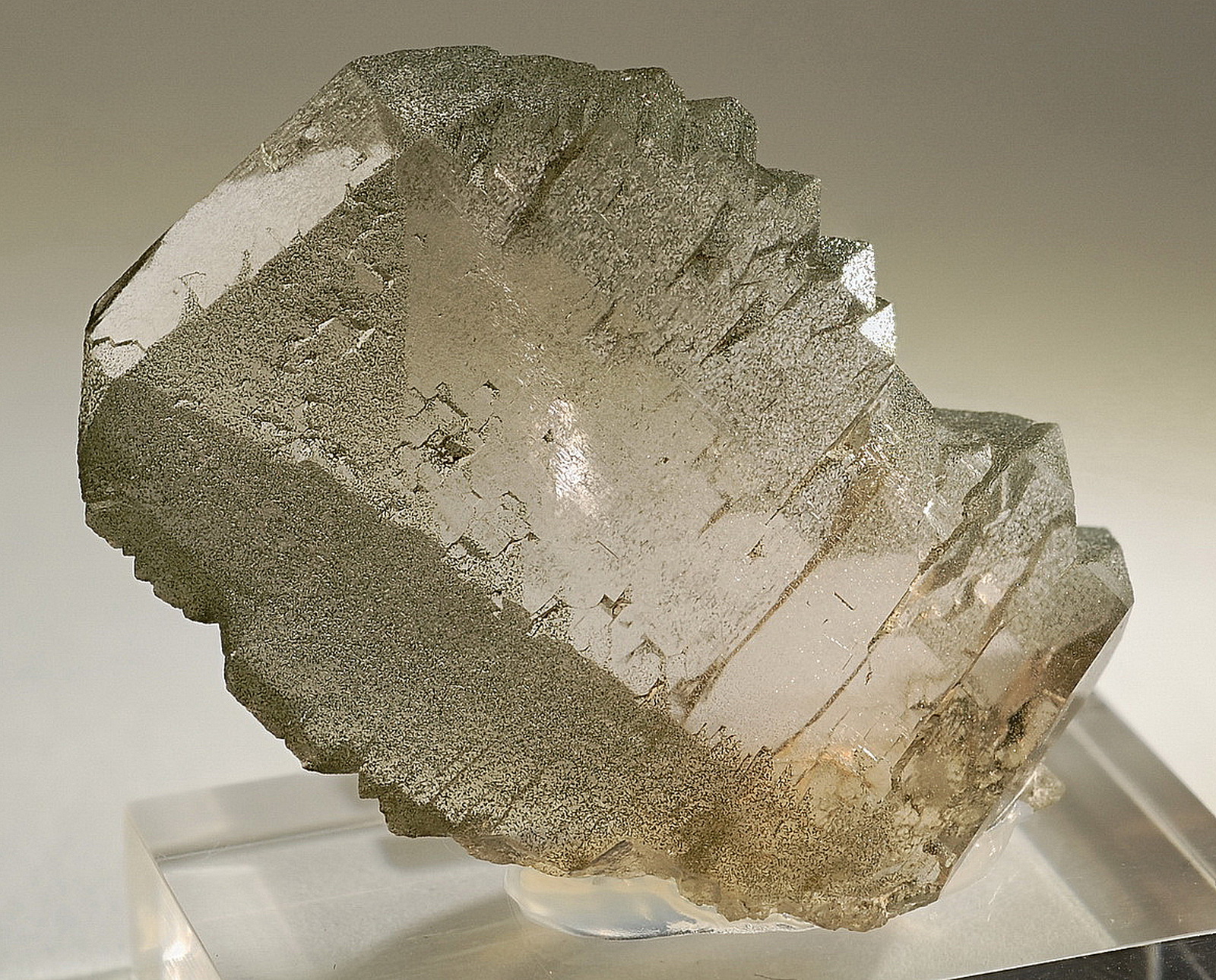 This is a huge sample of half-closed and half-open crystal habit! The entire crystal is totally transparent and clear throughout. no internal flaws! the very slight chlorite coating on some of the faces appears much stronger on the pictures, it is actually barely visible in person. Small contact faces on botttom and lower back side, but no damage! This is indeed an amazing gwindel, very hard to obtain this quality and size!