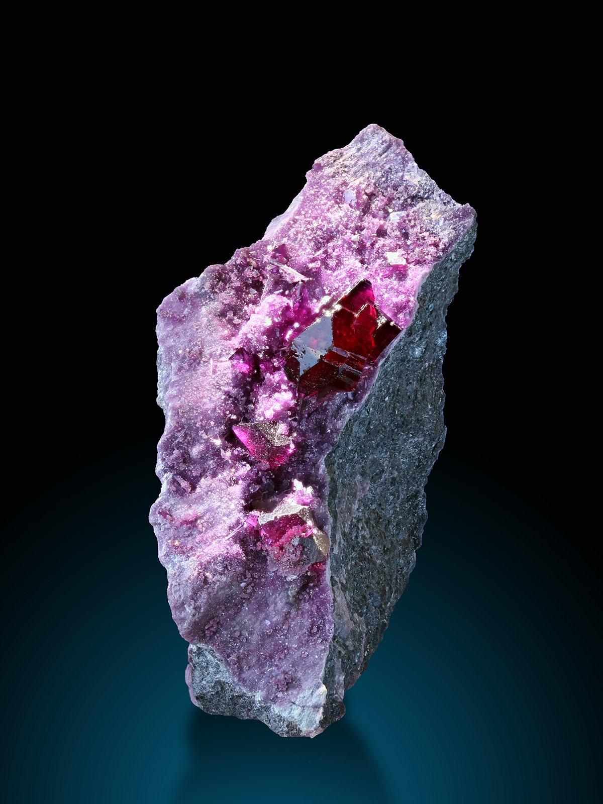 Sparkling, deep green garnets resting on mother rock. The main cystals are almost free of cracks and other detractions. Excellent sample from that Iranian locality. Great balance and composition.