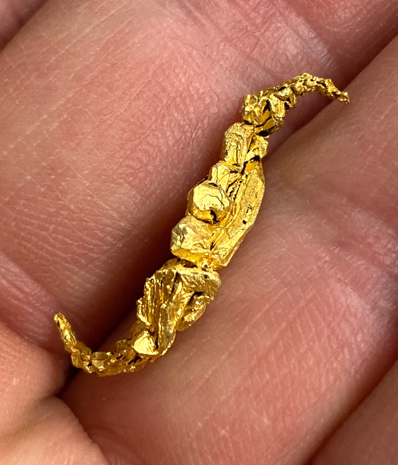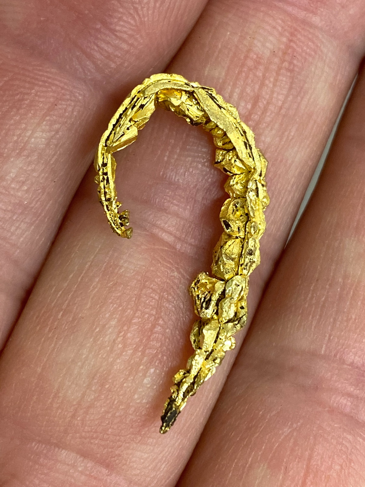 Sharp and lustrous gold crystals sitting on a curved gold wire!
