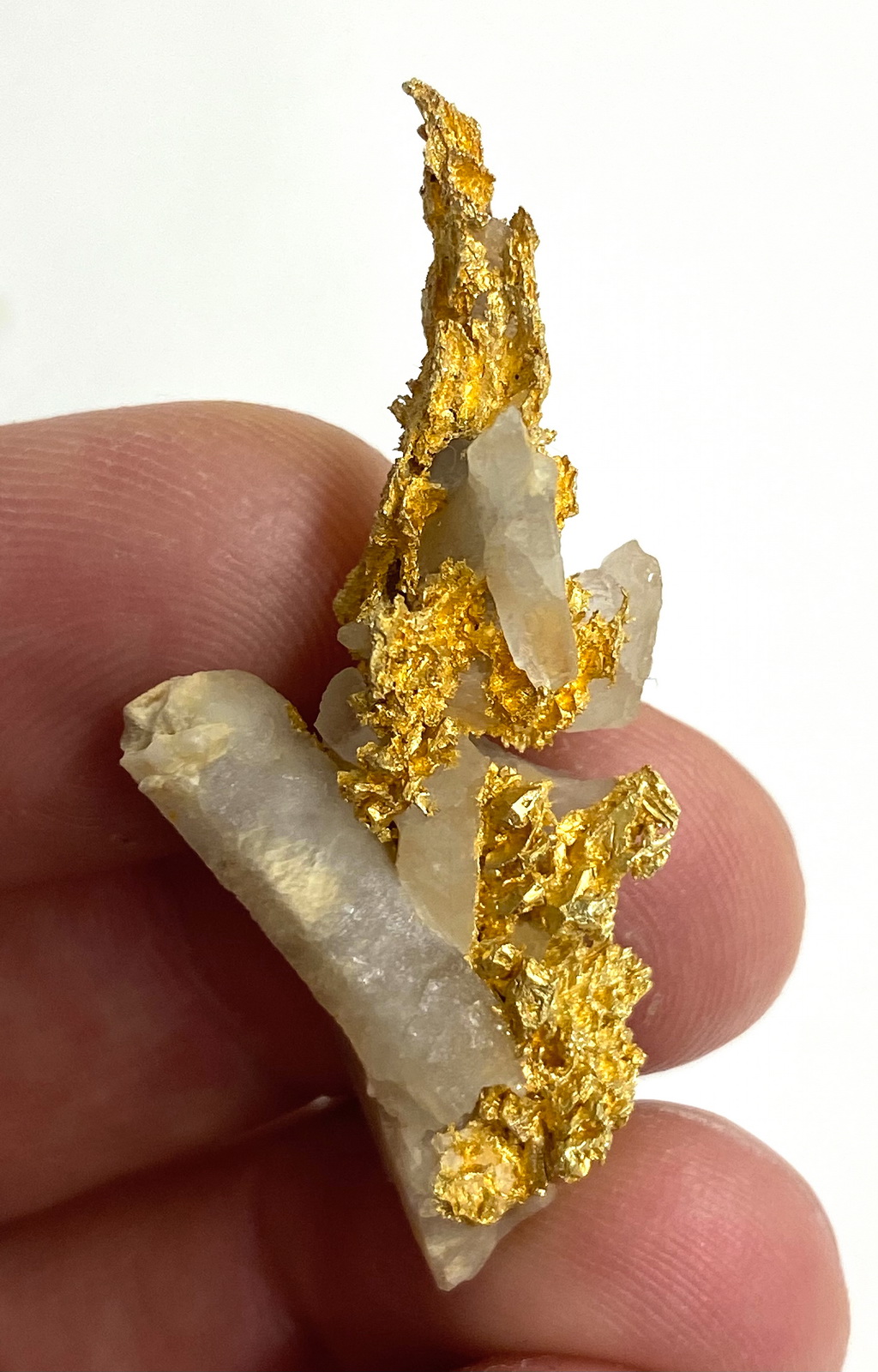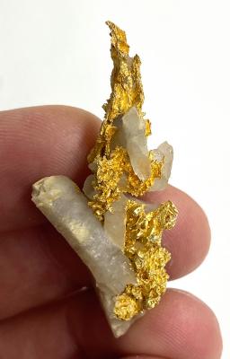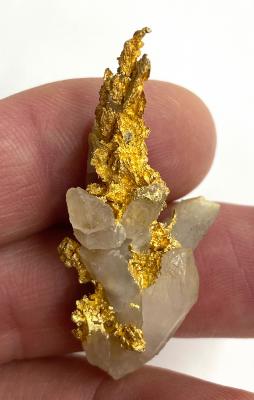 The only matrix specimen of the find. Gold perched on large quartz crystals, what a beautiful combination!