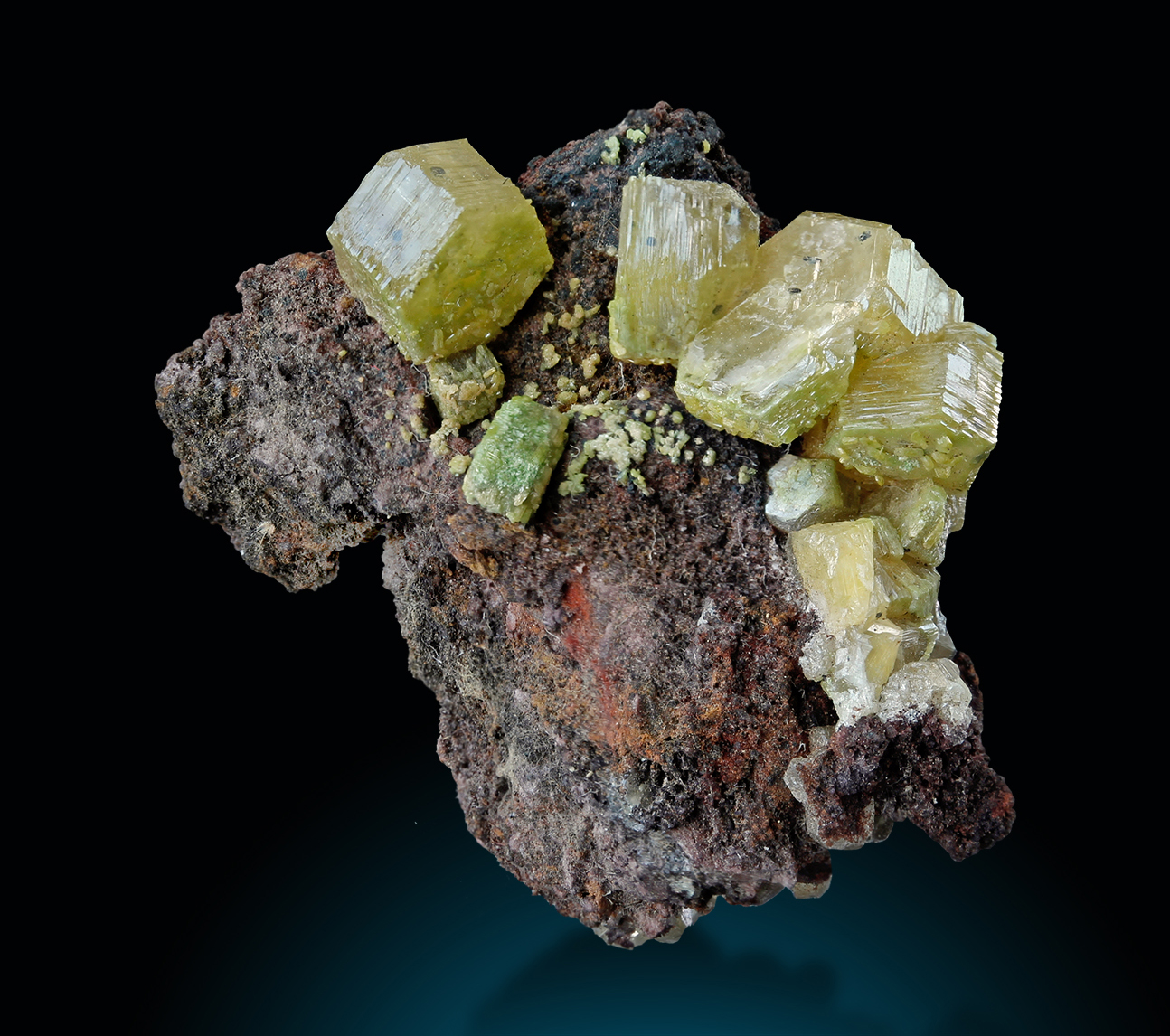 Rare material from this very uncommon locality. The Mount Bonnie mine was discovered in the early 1900s, it produced copper, lead, zinc and gold and finally closed around 15 years ago. It has produced only a small number of fine specimens like this one. The piece features several sharp, highly lustrous crystals in yellowish and olive-green colours scattered on dark, almost black matrix. Great contrast, very aesthetic and in excellent condition.