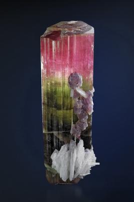 This is a fantastic doubly-terminated elbaite crystal featuring 5 distinct colour zones and very nice albite and lepidolite crystals in assciation. The specimen is a full floater and is in pristine condition all around. Ex Reinhard Dallinger coll.