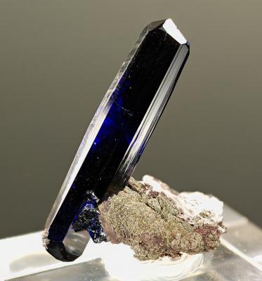 What a gorgeous azurite crystal on matrix! Incredible lustre, doubly-terminated, great elongated shape and gem blue in big sections when backlight, this crystal has all one can look for. Azurite is one of the premier species from this classic and now defunct locale, and this is an excellent sample in miniature size. Great condition and aesthetics! Ex Ruppenthal coll.