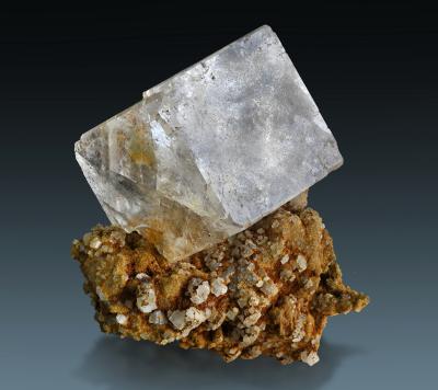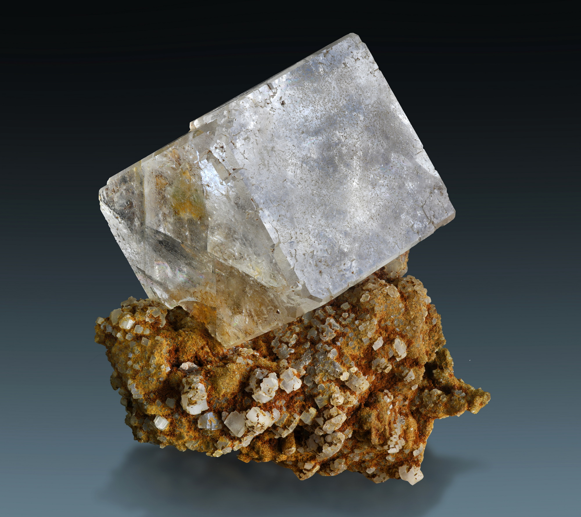 A clear and undamaged cube measuring 3.4 cm on edge perched on calcite crystals and iron oxides. The specimen is a complete floater and well crystalized on either side. The edges and corners of the fluorite feature lovely rhombohedral and octahedral bevels. A great piece for the advanced fluorite collector! Ex Oliver Konczer collection.