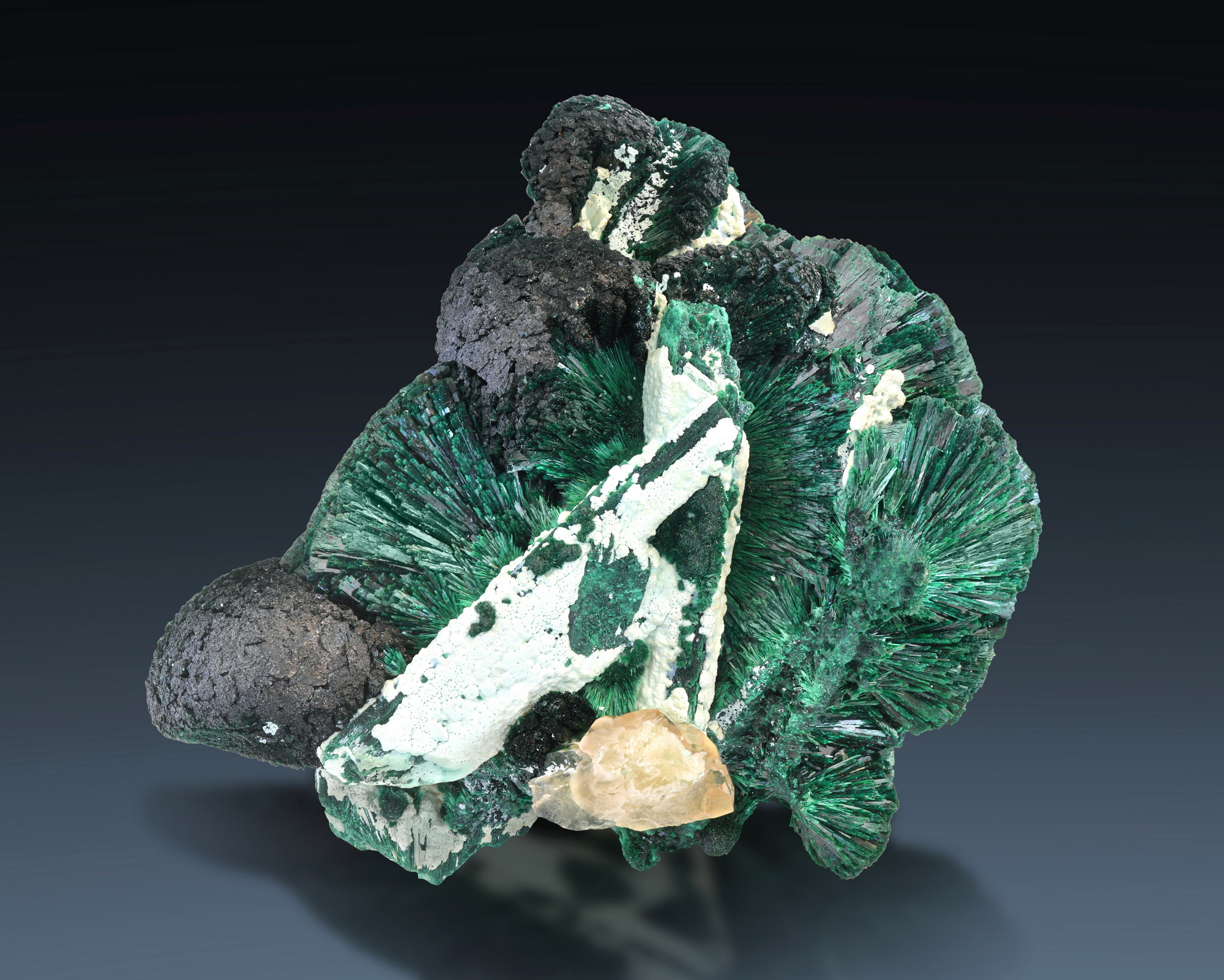 Wonderful sprays of lovely bright and vibrant green, primary malachites serve as a matrix for chrysocolla ps. barite crystals and clear yellow calcites. The specimen is a perfect floater and complete all around. The rear side is actually another very nice display side! Ex Oliver Konczer collection.
