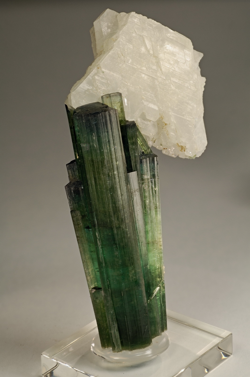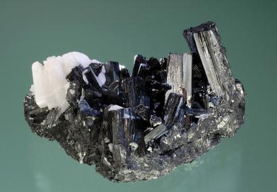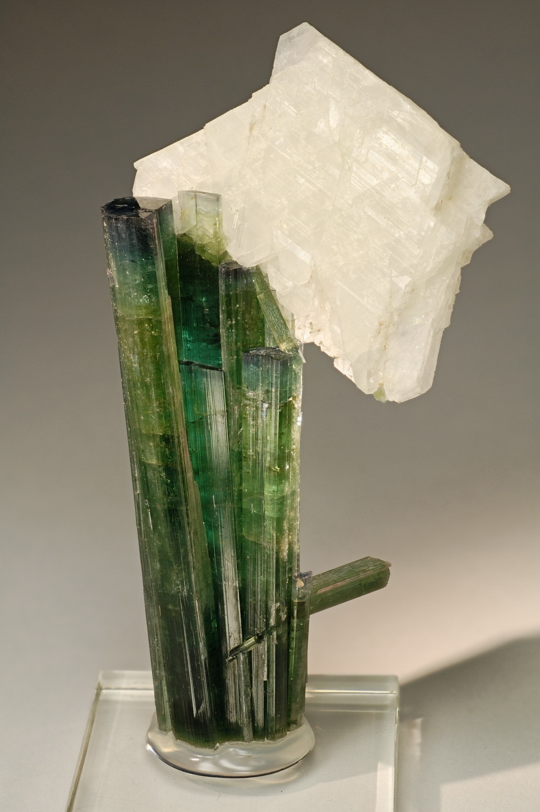This is beautiful spray of blue-green tourmaline crystals, a white albite crystal is sitting on top.