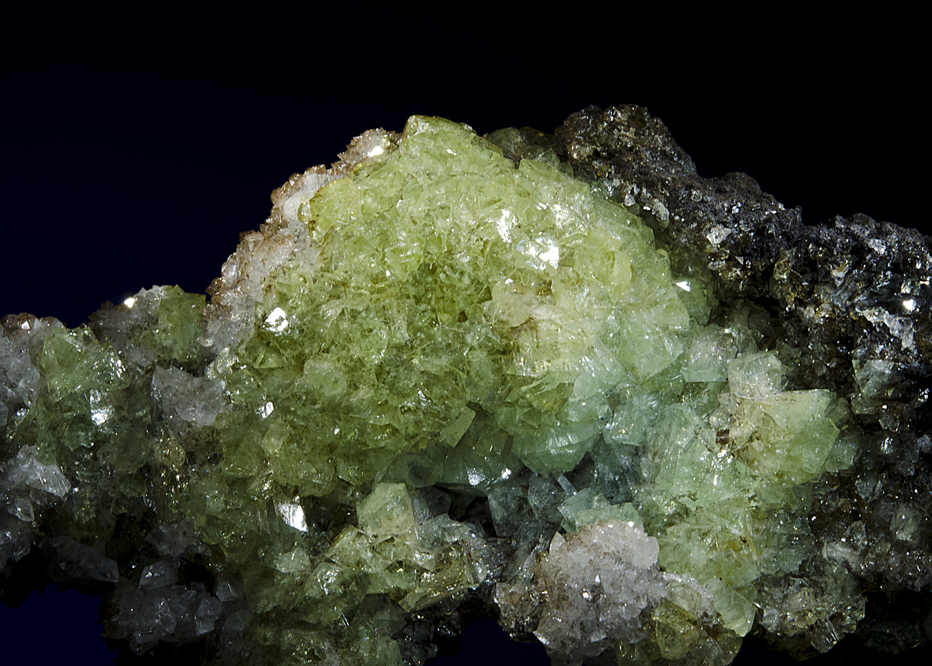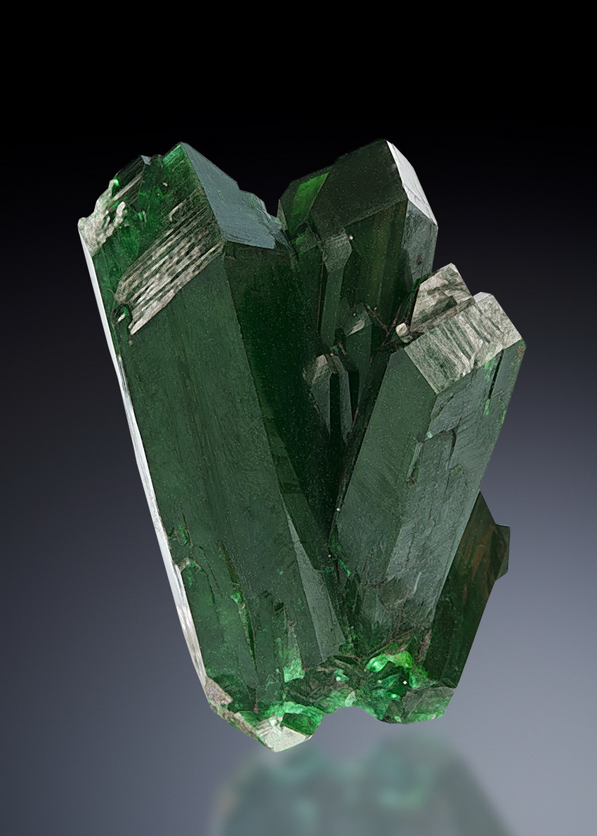 This is a highly aesthetic specimen featuring several freestanding crystal sheaves of pyromorphite. The crystals have a very nice olive green to brownish colour, and the main crystals show somehow hollow crystal formations at their terminations.