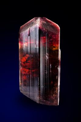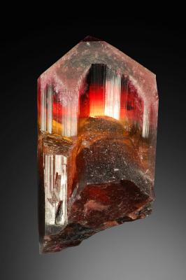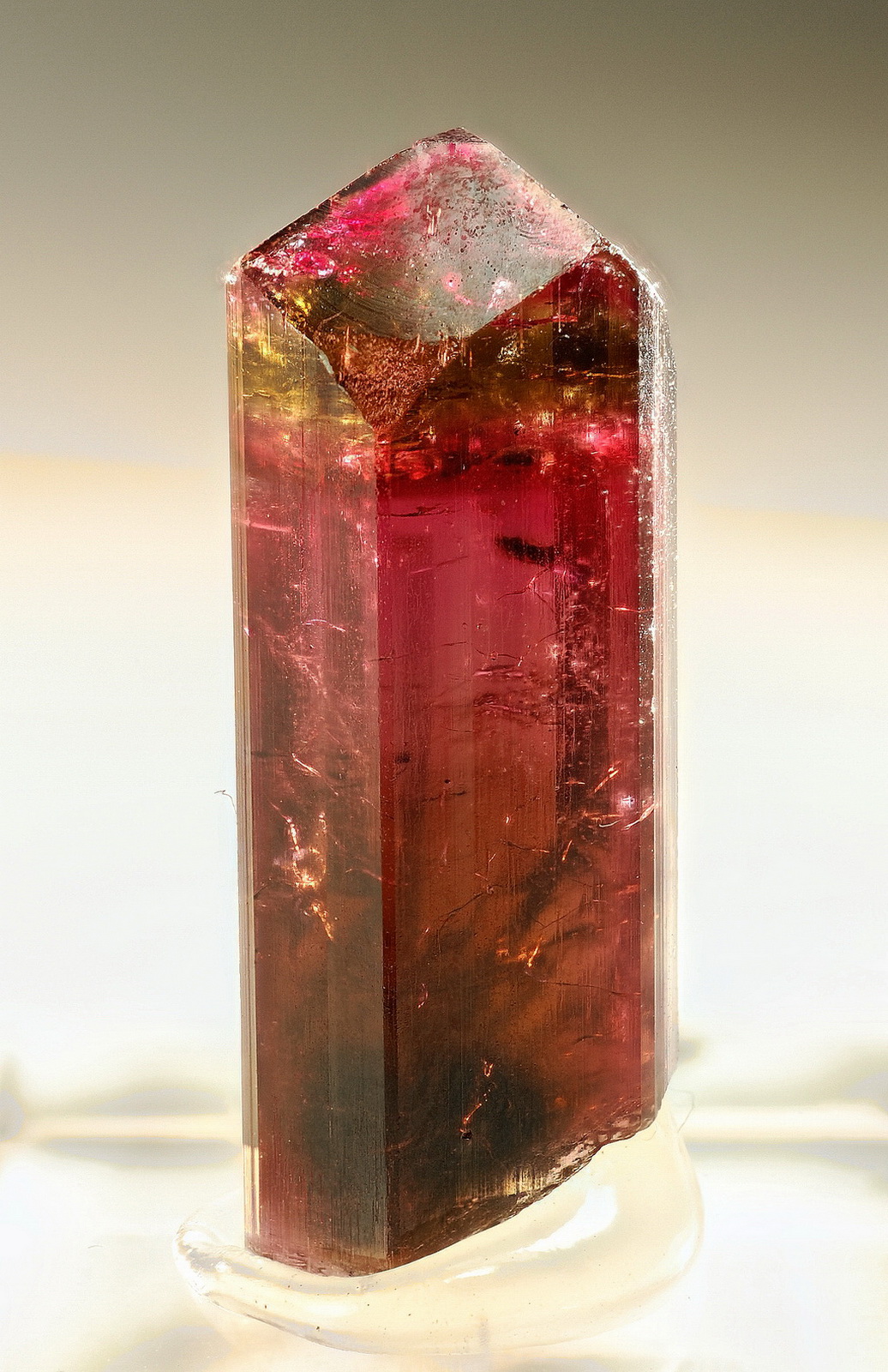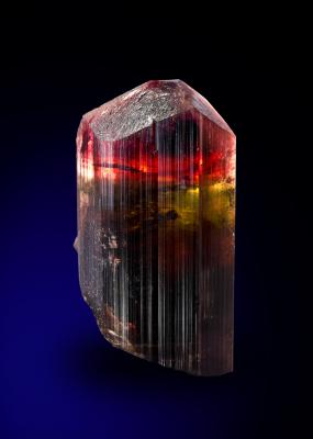 This is a large multicolour liddicoatite crystal with an amazing red cap and nicely bevelled termination faces. The colour will show up best when backlight (as shown on the pictures above). Aside the wonderful colours, the pcrystal features very nice striations on the prism faces and is in very good condition all around.