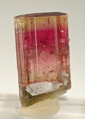 Single multicolour liddiocoatite crystal featuring a bright yellow-orange cap, followed by a very deep red, pink and finally an olive green layer at the base. Incredibly bright and open colours! Minor albite is attached on lower front side.